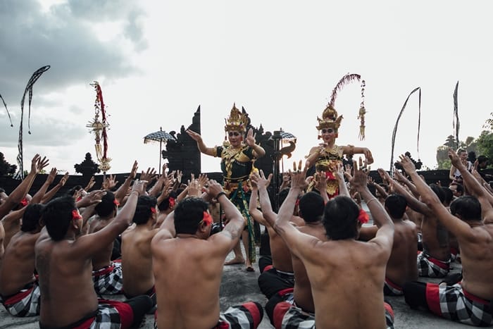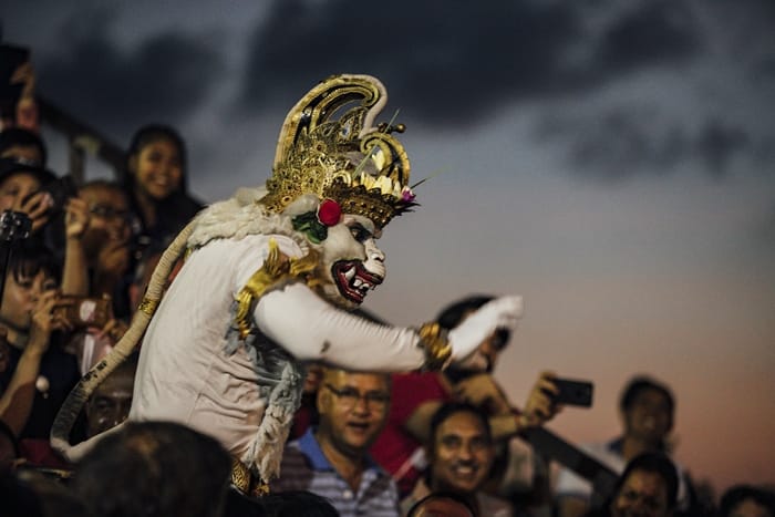 裹著格紋布襠的半裸男子們,哼著渾厚的「卡恰、卡恰」聲進場,氣勢浩大令人目不轉睛。接著,穿著傳統服飾的女子優雅登場,與帶來表演高潮的白猴子將軍,展開一場讓觀眾又驚又喜的演出。劇情走到尾聲,廣場上瞬間燃起熊熊火焰,真實地令人害怕,卻因為腎上腺素飆高,在心中對「卡恰舞」留下了震撼又難忘的印象。