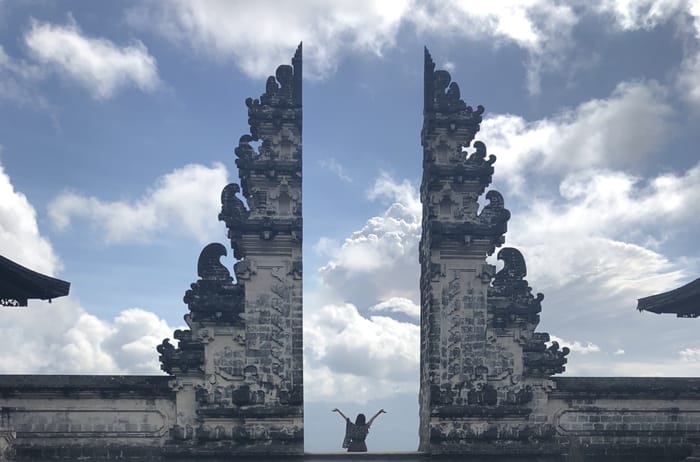 聖山活動頻仍不易親近,取而代之的是正對火山的連普揚寺(Lempuyang Temple),以嵌入善惡之門的絕美視角吸引了旅人視線。這座東峇里最大,也是最古老的寺廟高踞連普揚山上,從烏布出發,往返車程就將近6小時。