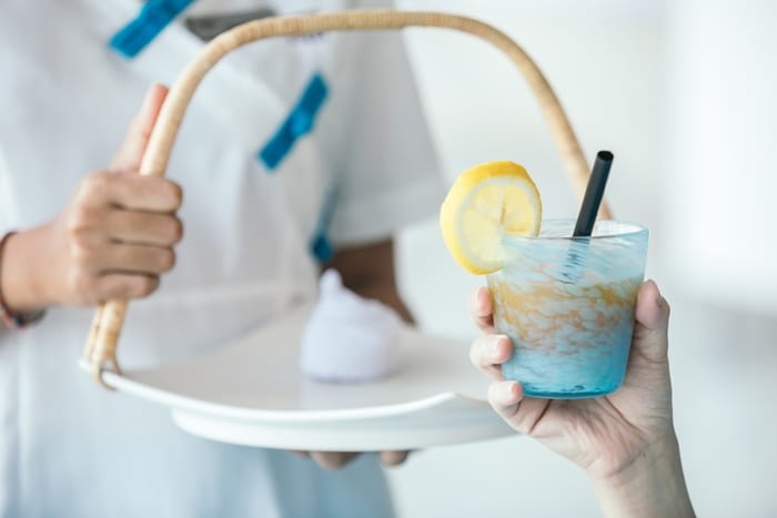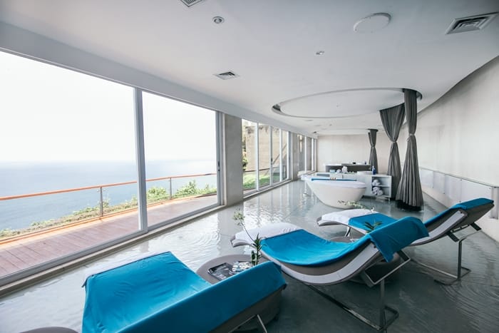 清爽的藍色與白色構成水療中心的主要視覺,地板上透著清涼活水,延伸至窗外海景,讓心靈更顯得遼闊無比。趴躺在舒適的水療床上,凝視遠方海平面,身體交給專業按摩師安撫平日緊張的肌肉,瞬間感受到鎮靜與舒適的美妙。