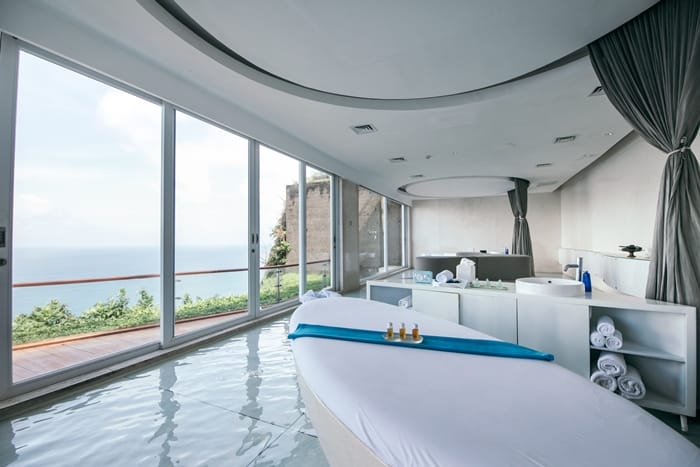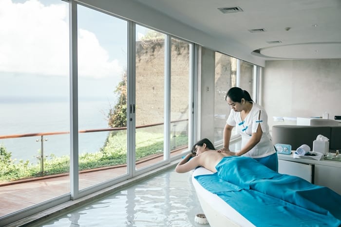 擁有居高臨下的面海景致,並提供多樣化的SPA療程,是峇里島南端極具人氣的放鬆體驗。創新的水療中心環境,靈感來自峇里島寺廟的聖水元素,輕盈空間讓人彷彿跟大海融為一體。