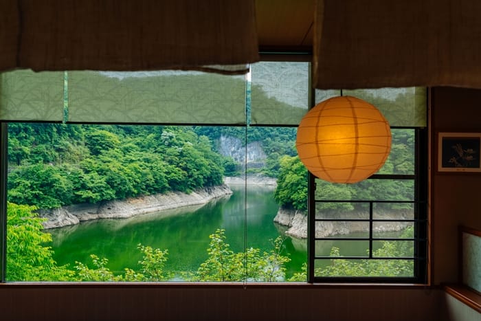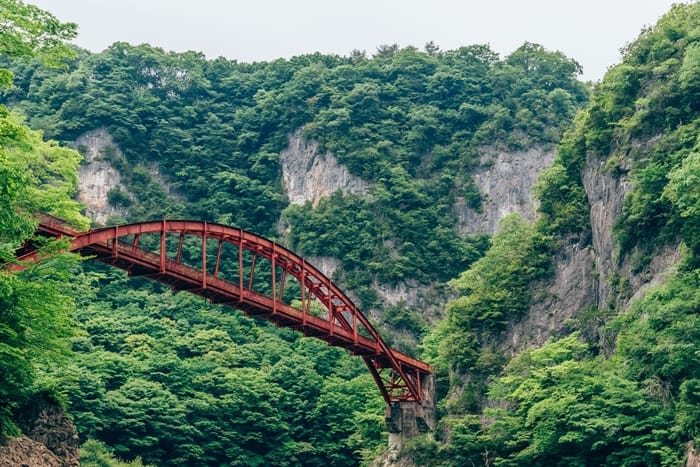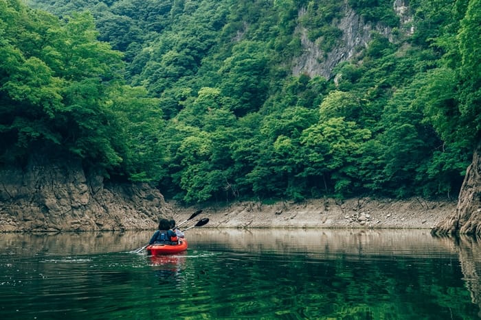 划著獨木舟在碧綠水潭中漫遊,豔紅色拱橋「雄橋」橫跨山岳之間,從湖面仰望格外雄偉壯觀。每年深秋楓紅季節,碧綠山巒染上艷紅、銘黃、橙橘等顏色,在湖水映照下,搖盪著魔幻旖旎的色彩。