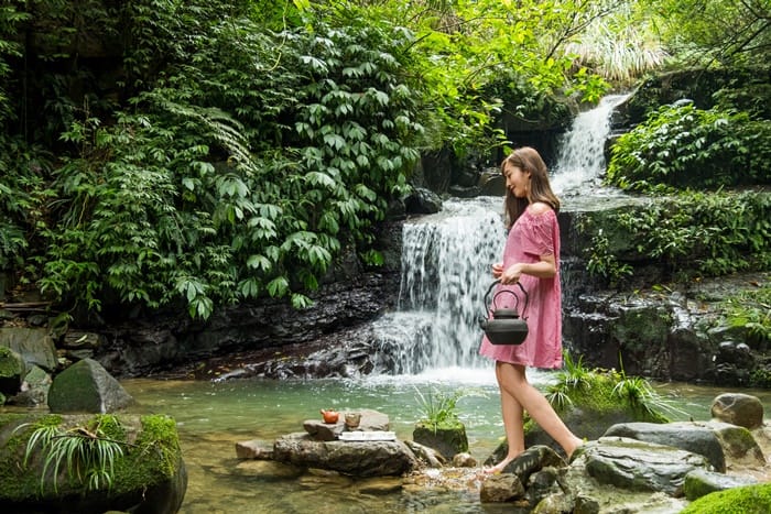 一個轉彎,不過往下走30步,溫差瞬間下降6度,樹林與溪流圍成天然的冷氣房,瀑布下、岩石上,典雅的茶具排開,我們沖茶、也沖了一身涼。