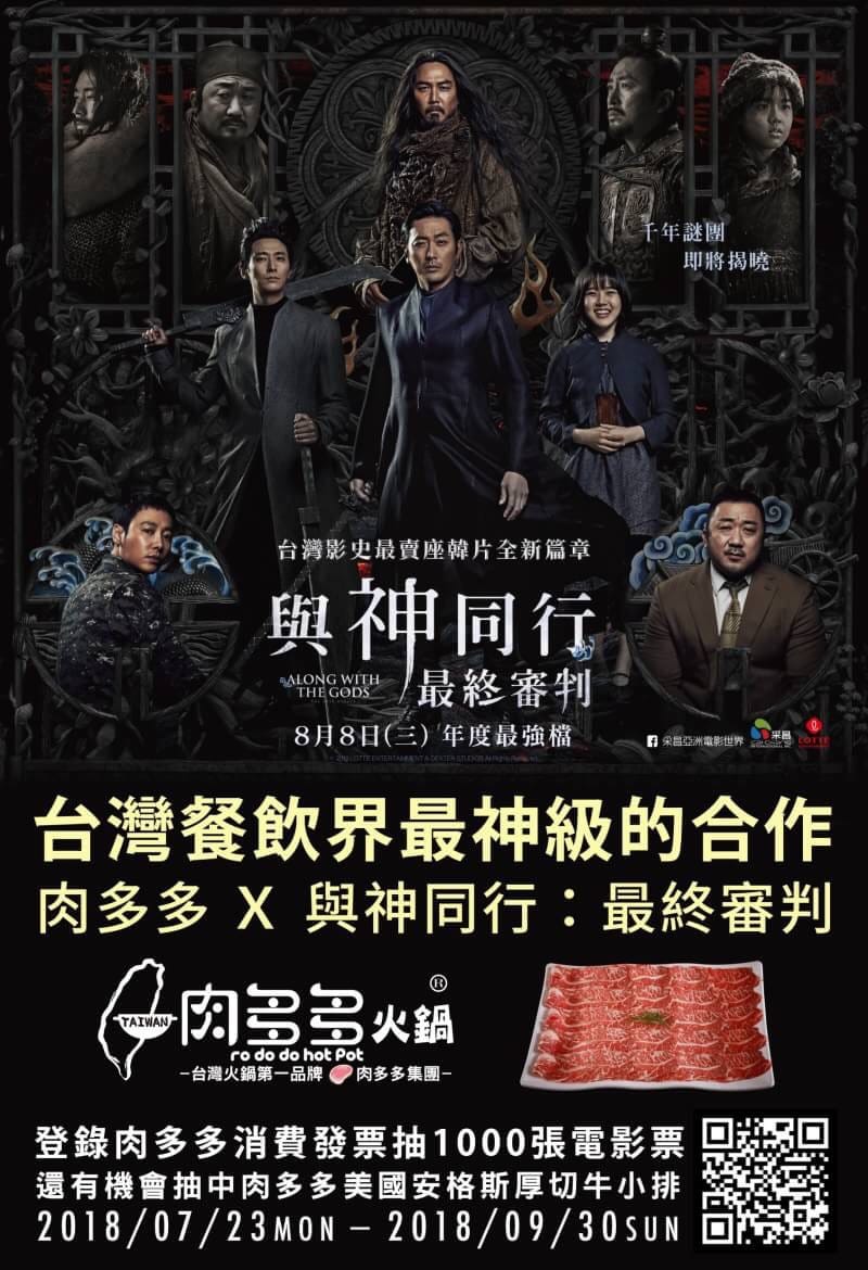 2017年台灣年度票房亞軍的韓國電影「與神同行」,續篇「與神同行:最終審判」搶攻今年暑假電影市場,特別相中以「積極展店」「暴龍級大份量肉盤」為號召,在台灣餐飲界中異軍突起的「肉多多火鍋」為合作夥伴,即日起至9/30期間到全國各門店用餐,上網登錄消費發票即可參加超高中獎率的三重抽獎,包括有I-PHONE手機、肉多多「美國牛小排」兌換券、電影招待券、RO虛擬寶物、下午茶券等獎項。