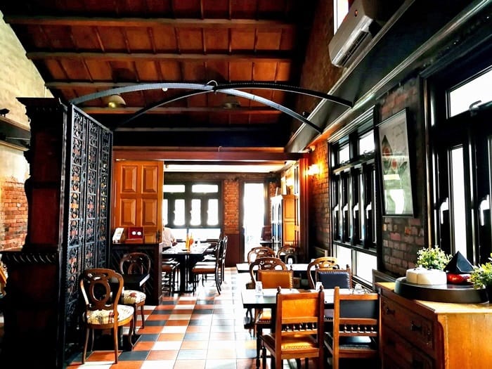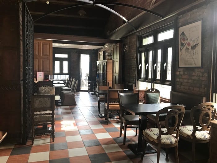 彷如走星光大道的階梯拾級而上,二樓挑高寬敞的用餐環境更覺舒適,自然光流瀉的空間氛圍充滿濃厚懷舊風,整面紅磚瓦牆、溫潤木頭元素、復古格紋地磚,窗花拉門所構築,在在有種老上海的餐酒館風味,是台北市難得所遇的百年建物。