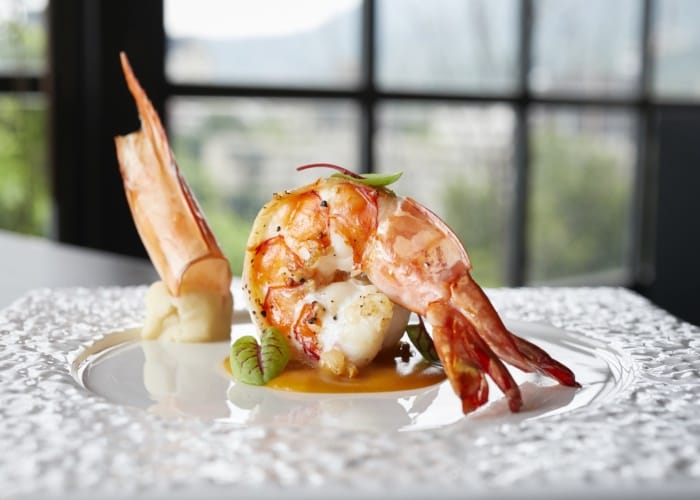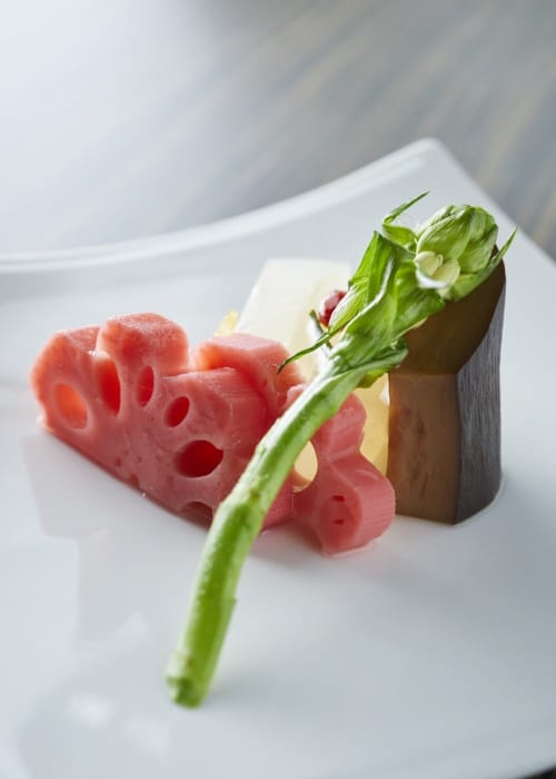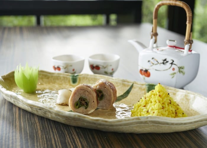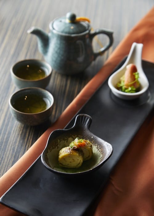 在漢卿美饌餐廳內品嘗少帥套餐,也品味張學良的養生之道。張學良嗜吃蝦,主菜當然少不了香煎明蝦,蘸上濃厚的蝦膏醬汁一同入口,味鮮美、肉Q彈,而蝦頭則有炸過的香氣,可謂色香味俱全。另一道餐點的盤子外型有如台灣,其擺盤饒富意趣,來自嘉義的豬肉捲著剝皮辣椒,擺放在盤子的中間偏下方,對應的不正是嘉義在台灣的地理位置!盤子最下方配有染上鬱金香黃的藜麥飯,而台灣的中南部正是魚米之鄉。蒸蛋包昆布、松葉蟹,一口一個,有著日式的精巧雅致。套餐最後一定有道四小姐的獨門蔬食,梅子滷的蓮藕、醬油滷的杏包菇、高湯滷的冬瓜,清爽不膩,也呼應張學良與四小姐的鄉野生活。漢卿美饌的套餐,從前菜到收尾、從擺盤到入口,一切都經過精心設計,讓吃飯同時兼顧氣質優雅。