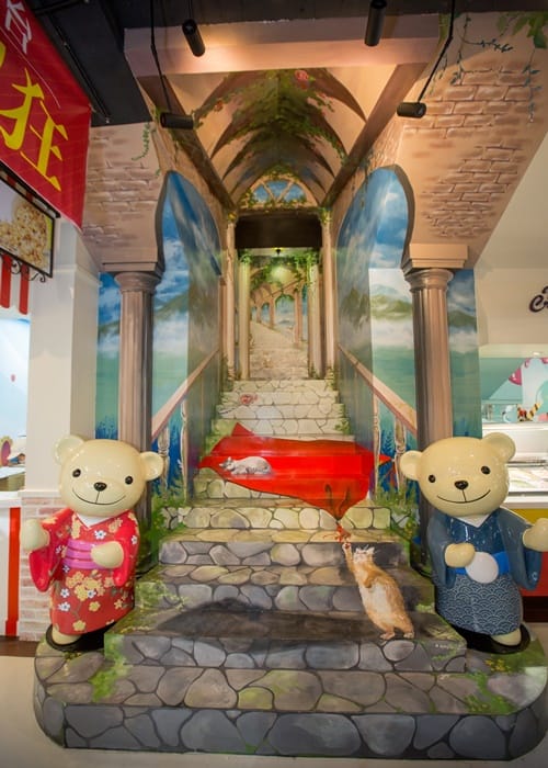 此外,體驗館也是打卡拍照留影的好地方,除了室外有彩繪牆,館內亦設計許多超可愛的背牆與佈景,像是入口旁的書本彩繪牆,互動遊戲區的甜點糖果屋教堂,兔子拿著大鑽戒求婚,沉思的巨人,還有超萌的兩隻熊在彩繪樓梯歡迎大家的場景等等,不由得大聲說真是太可愛了。