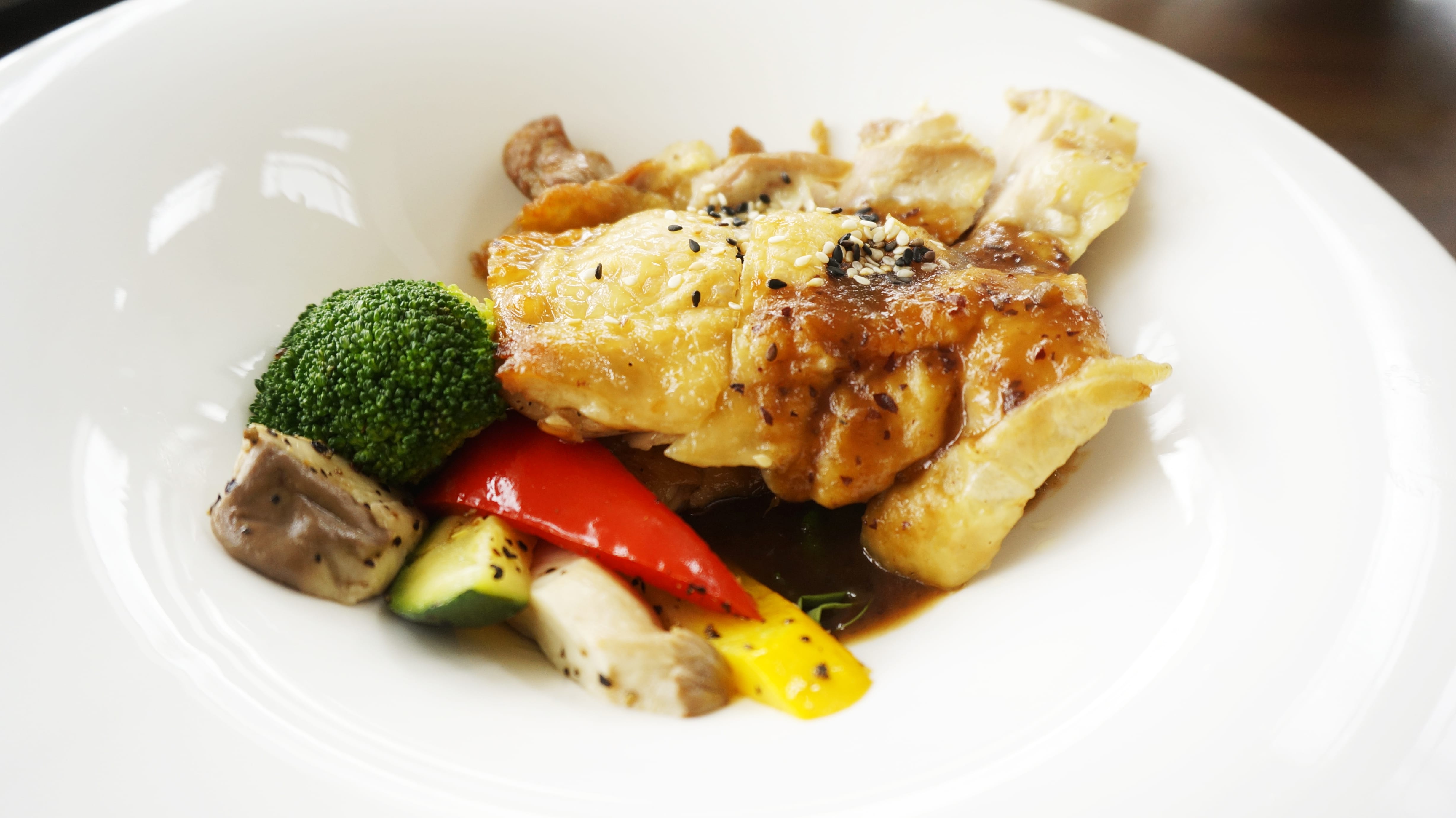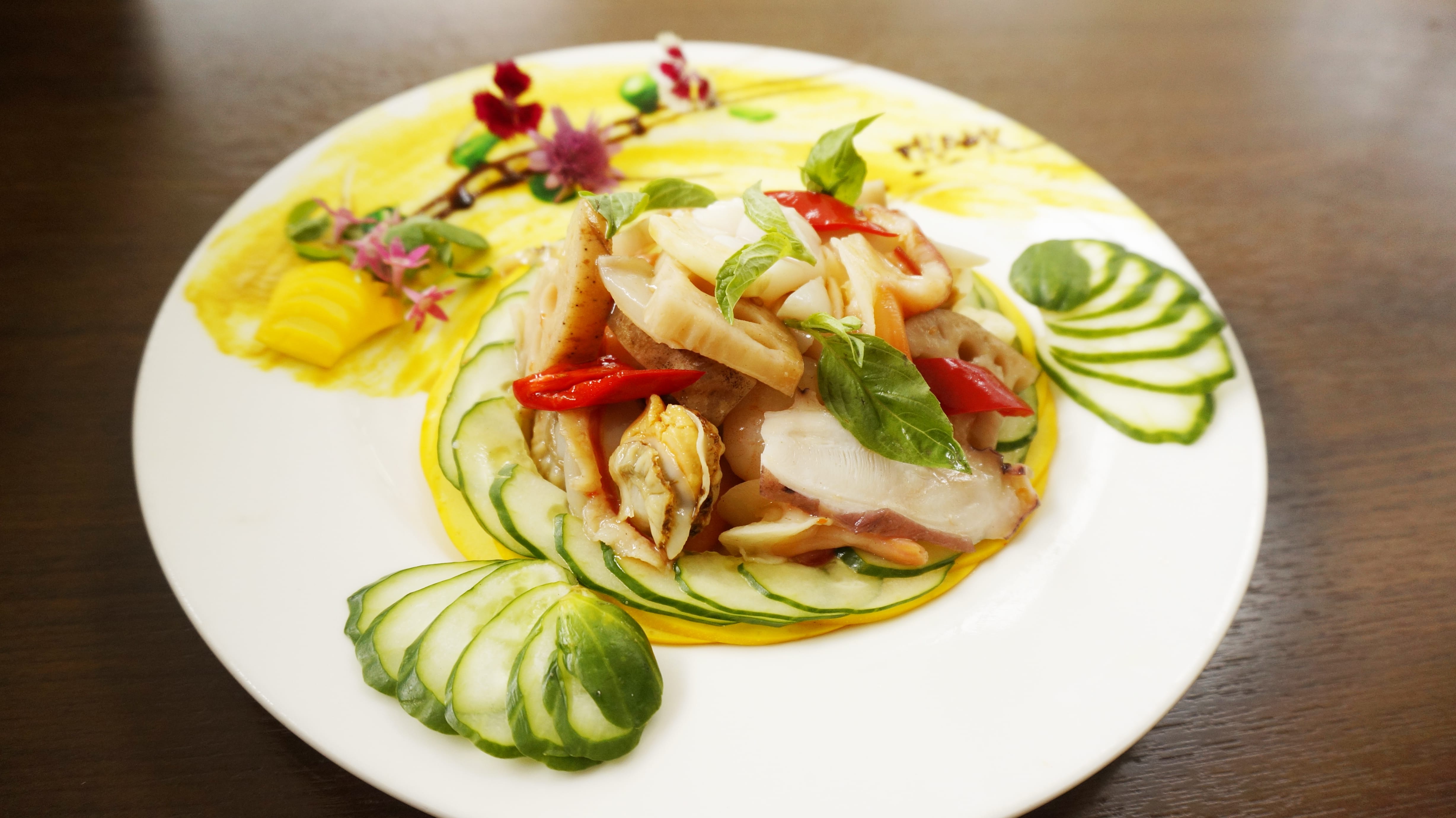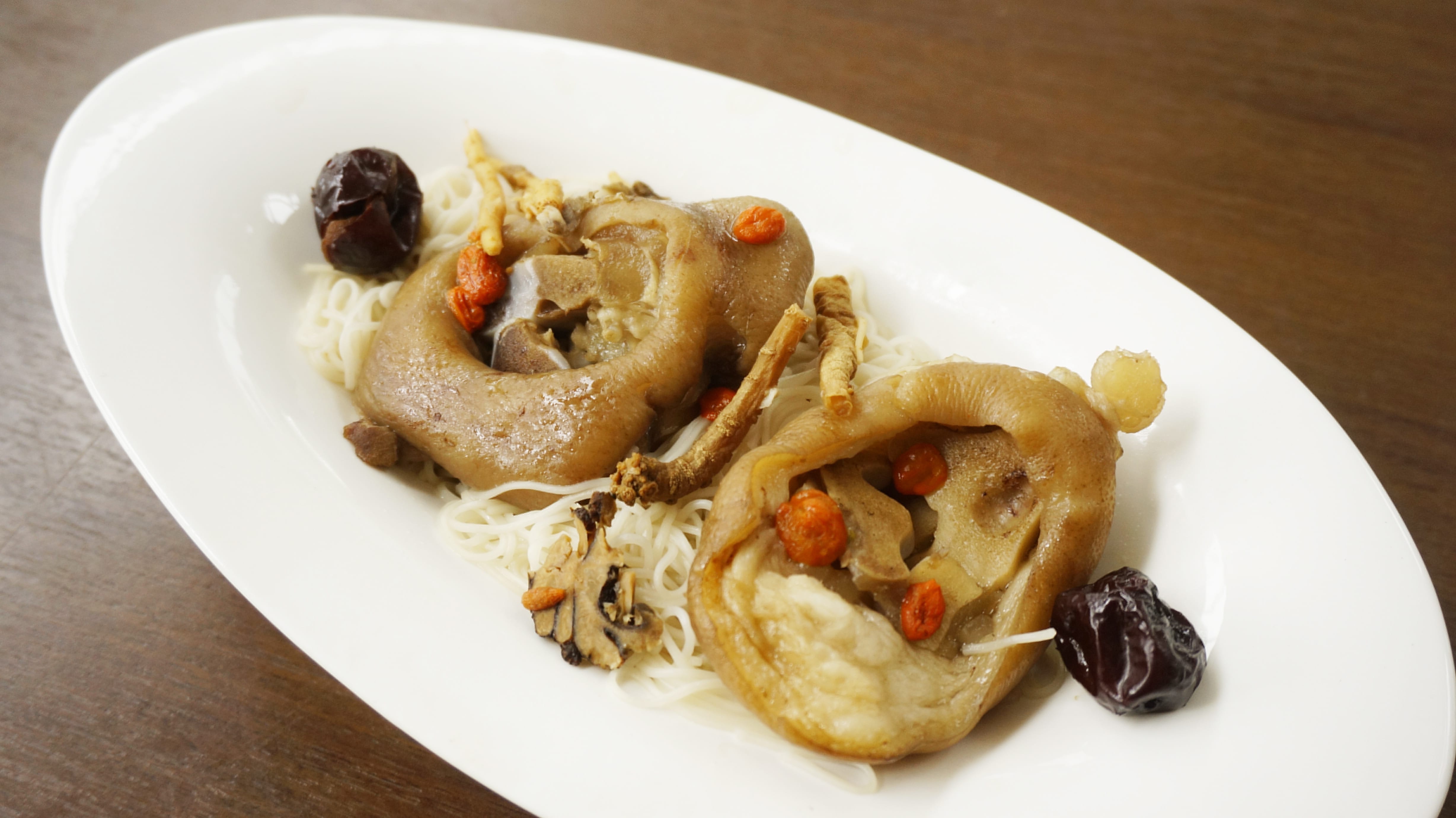 除了泡好湯、遊草山之外,時序入秋,養生首重潤氣防燥,主廚特別選用紅棗、百合、蓮子、黨參等最具台灣代表性食材入菜,像是「蓮藕海鮮拌塔香油漬」將秋季新鮮海產蘭花蚌、章魚、象牙蚌等汆燙,加入當季盛產食蔬蓮藕、黃瓜,並以櫛瓜點綴盤飾,佐以九層塔獨特香氣,爽脆入口、Q彈有味,是一種潤肺養生的中式美食。「紅棗烤鮮雞」取台灣仿土雞腿肉烤熱,淋上主廚秘製台灣特選紅棗及韓國紅棗醬獨門醬汁,再以黃、綠鮮蔬妝點,口感鮮嫩、香氣宜人、補氣養血。「藥膳豬蹄」主廚特選上等人蔘鬚、黨蔘、枸杞、紅棗等珍貴中藥材,將台灣黑毛豬腳蹄慢火燉煮入味,讓豬蹄軟而不爛、膠質彈滑,再加入新竹手工麵線,淋上鹿港黑芝麻油,完美絕配,為這一季的秋冬積蓄滿滿活力能量。
