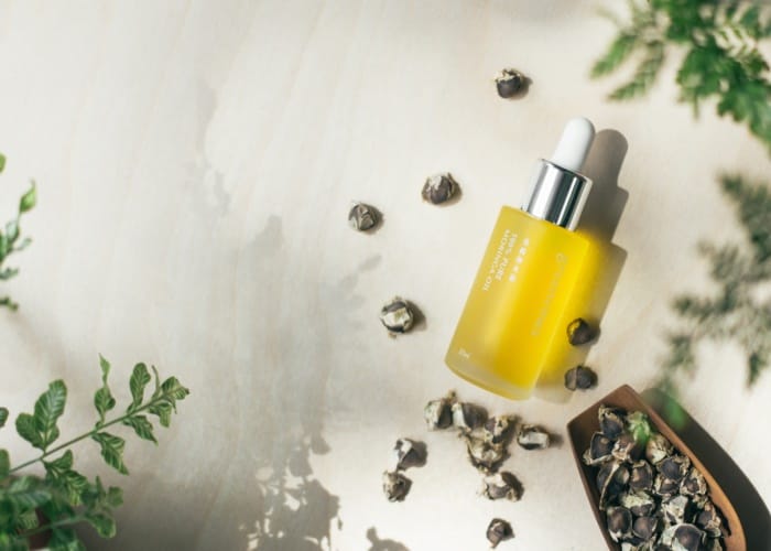 多元化的保養面向,也是辣木油深受消費者喜愛的原因。單獨使用時可以取代乳液、乳霜作為最後一道保養程序,也能取1-2滴加強在眼周,或是臉部暗沉處。夏天時則推薦調和使用,可以加在平常慣用的化妝水或精華液內,甚至是與粉底液做混和,都能為肌膚帶來健康亮澤感,同時創造更服貼細緻的日常妝容。