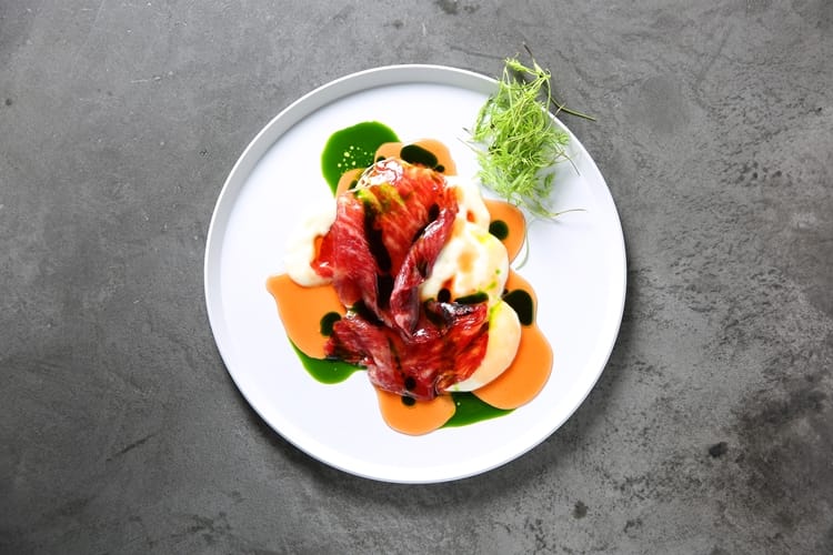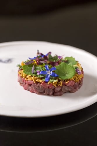 這盤生菜,顛覆傳統沙拉生食的觀感,有的油炸、有的汆燙,讓每種食材都吃到不同層次的滋味,外觀美得令人印象深刻,嚐在口中同樣令人難忘。另一道韃靼生和牛,以蛋黃混入生和牛及菜脯,有牛肉滑順綿密的香氣及古早味菜脯的口感,值得一試。