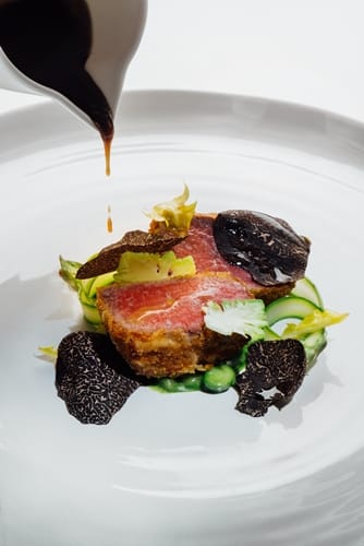 主廚Bombana,還受封皮埃蒙特大區(Piemonte)阿爾巴白松露的國際大使,成功將阿爾巴白松露推至亞洲。白松露的季節在秋末冬初之際,接著就是黑松露的季節,白松露的氣味較黑松露淡,因此一般人對於白松露的接受度較高,而Bombana最擅長的正是將是松露運用搭配於各式料理中。最新一季的菜單中,主廚選用與白松露同鄉也是來自義大利皮埃蒙特大區的Fassone牛,頂級的牛肉與矜貴的黑松露配對,肉香與松露香氣迸出絕美火花,是饕客不可錯過的夢幻逸品。