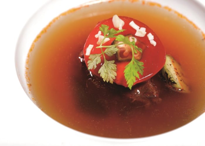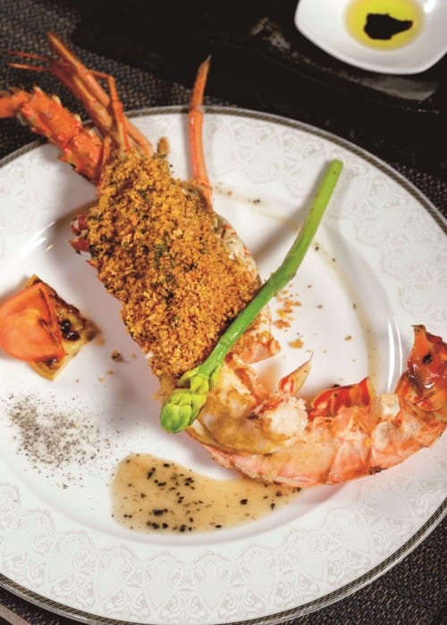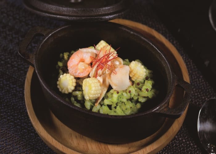 招牌燉飯以鑄鐵鍋裝盛保溫,今推薦羅勒青醬海鮮燉飯,正統義式做法,吸收雞高湯精華,濃郁米飯有嚼感,加入養生紅藜麥,營養更加分。以避風塘做法的貝里斯龍蝦,Q彈肉質滿溢炸蒜酥香味,令人意猶未盡,而超大隻的智利帝王蟹不需過多調味,以白酒蒸熟就很誘人。佐賀和牛先煎3分熟,再放置玫瑰鹽板上熟成,讓牛肉吸取玫瑰鹽天然鹹味,之後再煎過,這焦香的味道,入口即化的軟嫩多汁,深深被臣服。更驚艷的羊排完全沒有羊騷味,點綴開心果、花生糖,風味層次更提升了,最後以鐵板方式做成的提拉米蘇甜點更是完全大滿足。