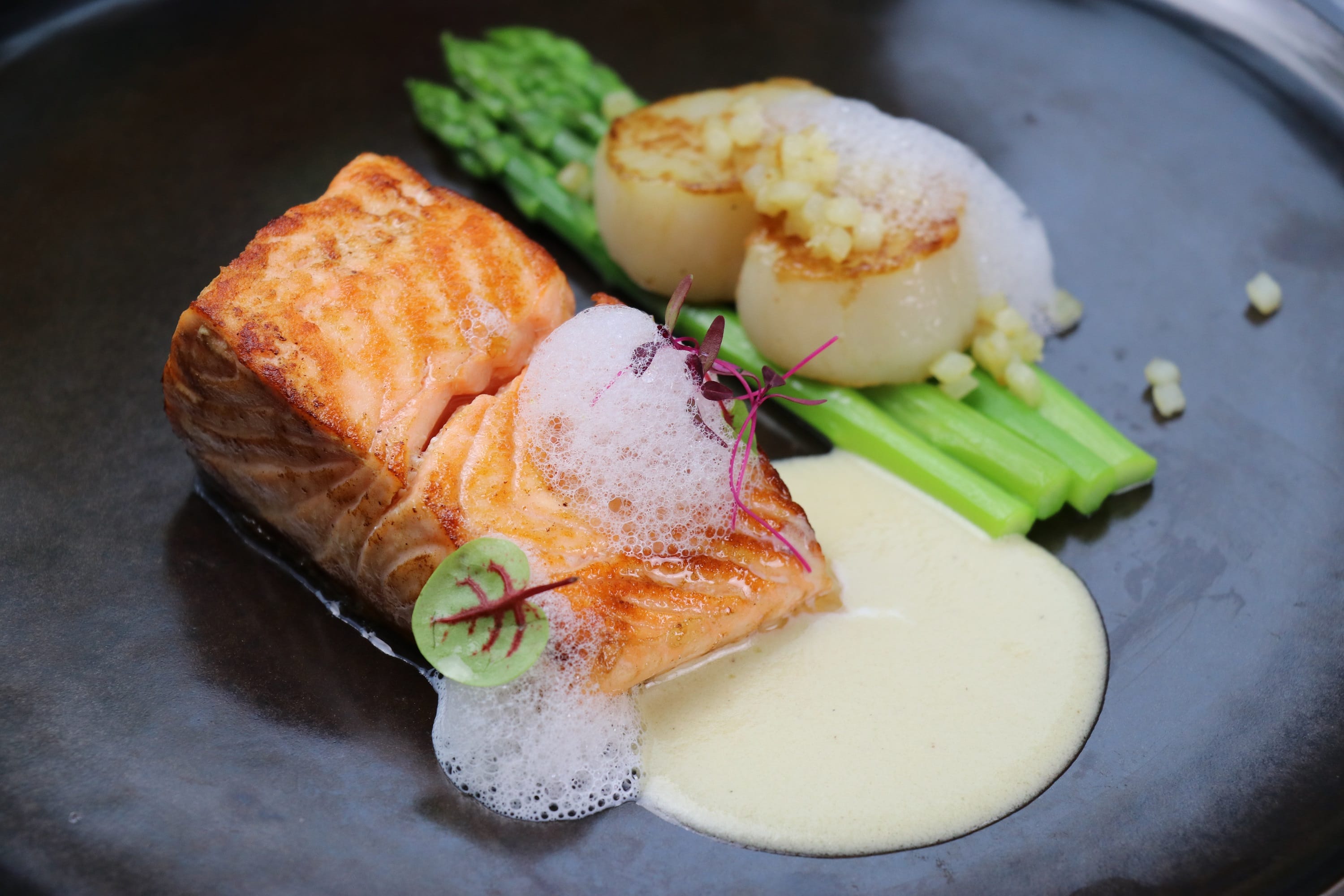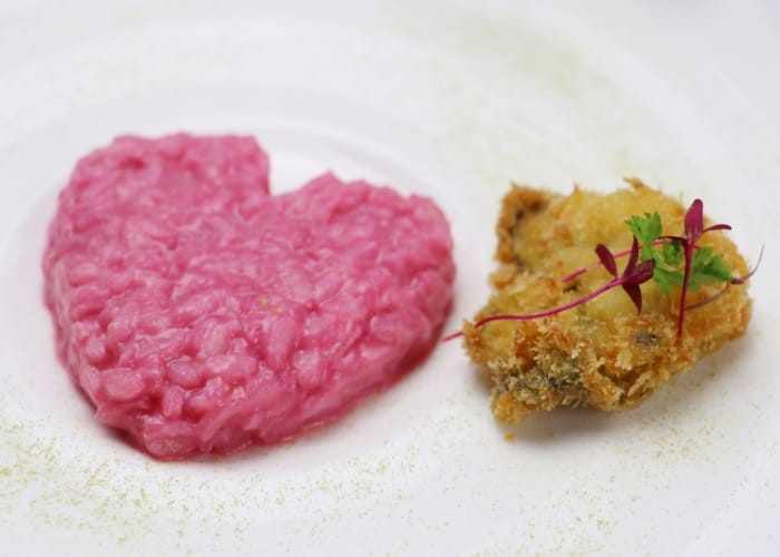 「昕花怒放情人套餐」(雙人NT$3,344+10%,活動期間2019/2/14-17),宜客樂西餐廳主廚簡志宏特別為情人節研發和風洋食精緻菜譜,包括「青澀愛戀」特調雞尾酒呈現魔幻漸層,採用當季草莓及微氣泡飲讓心更跳動,前菜東石牡蠣愛心燉飯,海鮮搭配紅甜菜燉飯平衡大海鮮味,主菜可選美國Choice爐烤牛小排佐小農時蔬或嫩煎鮭魚干貝佐薑味醬汁,還有紅玫瑰泡沫蘆筍湯品,套餐設計細膩充滿熱戀粉紅泡泡。