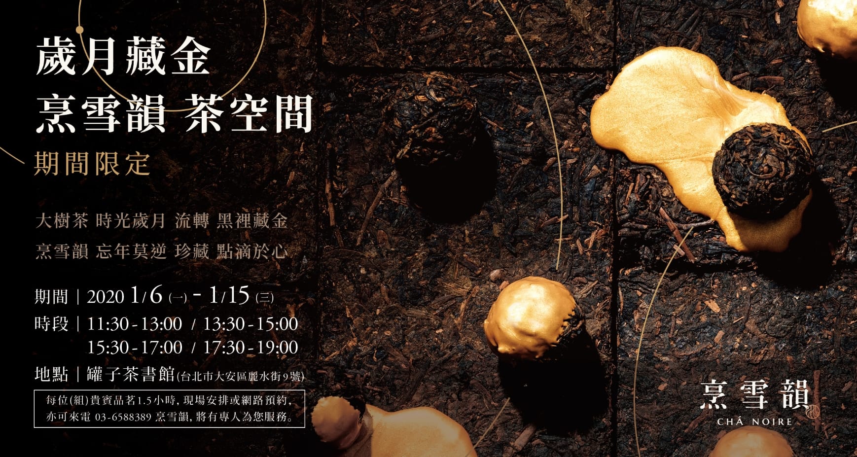 【歲月藏金.烹雪韻.茶空間】 大樹茶 時光歲月 流轉 黑裡藏金 烹雪韻 忘年莫逆 珍藏 點滴於心 烹雪韻與「罐子茶書館」合作推出期間限定茶空間 以歲月藏金為題,將大樹茶的典藏價值呈現於茶席 大樹茶隨著時光歲月流轉,從新茶鮮醇到餘韻悠長 與時光共舞風味一轉再轉,直到將最美好呈現給您 期間:2020/01/06(一)~2020/01/15(三) 地點:罐子茶書館 (台北市大安區麗水街9號) 時段:11:30~13:00/13:30~15:00/15:30~17:00/17:30~19:00 烹雪韻-熟茶:圓圓、老茶頭 烹雪韻-生茶:團團、大雪山、野生秘境、野茶王 烹雪韻-藏茶:東方美人、古樹紅茶 *每款茶15克,價位350元起,基本茶水費150元/人。 每位(組)貴賓品茗1.5小時,現場安排或網路預約 亦可來電03-6588389烹雪韻,將有專人為您服務 預約表單:https://forms.gle/bbJfwV5tyC8Q58aX7