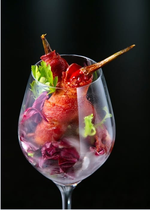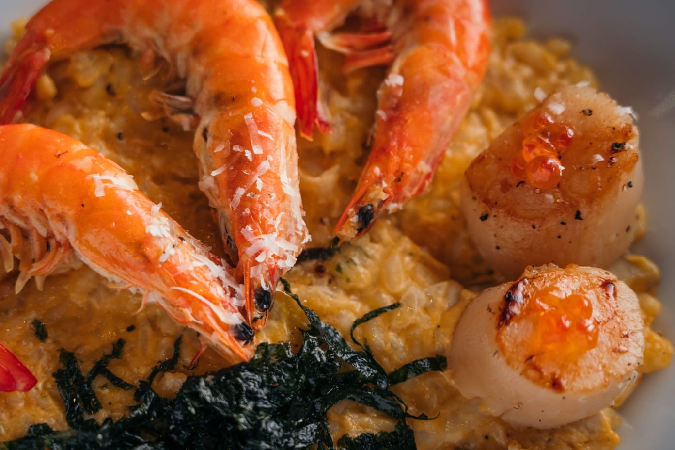 呈現秋冬溫暖色系,干貝鮮蝦南瓜燉飯選用進口大干貝肉質鮮彈點綴鮭魚卵,還有新鮮明蝦,將義大利米、起司與南瓜一起燉煮,米心微微有嚼勁,吸附湯汁精華和南瓜甜味,層次豐富、暖潤濃郁,吃不膩的綿密好滋味。若不知要選哪款酒搭配,伺酒師提供專業挑酒與配酒知識,您可以先試喝一口再做決定。