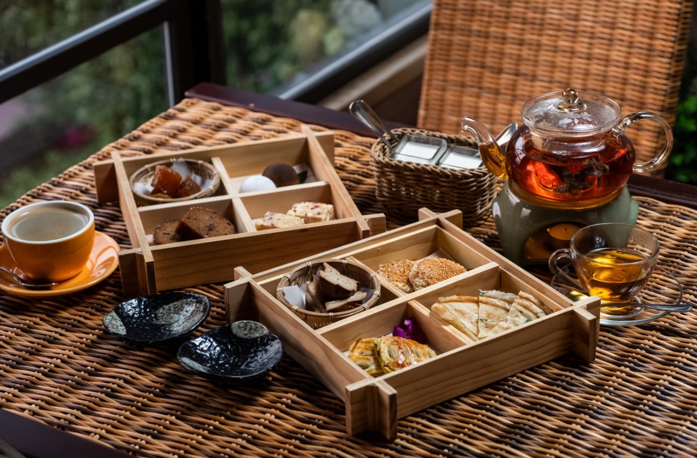 1960年期間張學良與趙四小姐曾幽居於此,所以有著豐厚歷史故事,園區依主題設計,少帥紀念亭、小六茶鋪、漢卿美饌、足湯區到雙喜湯屋,各區皆有特色,值得細細品賞。想要俯瞰全區風貌,就先到「小六茶鋪」品嘗下午茶,這裡是園區的最高視界點,可以一覽北投風情,將關渡平原、觀音山及附近滿山綠意,白煙裊裊地熱谷全都映入眼簾,晴天時陽光透過窗櫺撒入,天陰時雲霧飄渺、各具詩意。總經理陳彥勳表示這裡也是當年做為警衛隊宿舍之用,因張學良少帥乳名小六子,遂取名為「小六茶舖」。東北點心是少帥對故鄉的美好回憶,「小六茶舖」的少帥東北懷鄉雙人套組下午茶,特別融合東北點心及台灣在地食材。內容分為甜點、鹹食分置於木盒中,別有一番風味,加上店內充滿童趣的陳設,IG打卡上傳非常受歡迎。甜點有內餡為花生和紅豆的雙色麻糬,加了核桃的黑糖糕,鬆鬆QQ的雪Q餅,融合蔓越莓乾、果乾、餅乾,口感層次豐富,還有蜂蜜番薯;鹹點包括青蔥燒餅、滷豆干、咖哩派、蔥油餅,象徵著少帥與夫人趙四小姐兩人在台灣體會的好滋味與人情味,不論是大人或小朋友都很喜歡。雙人套組還附上有機豆漿奶酪、咖啡及紅茶,優惠價NT1200+10%,另可加價加點其它飲品,如果想要泡湯,少帥東北懷鄉雙人套組+精緻湯屋+養生玫瑰醋乙瓶,優惠價NT2699,少帥東北懷鄉雙人套組+豪華湯屋+養生玫瑰醋乙瓶,優惠價NT2999,(限周一至周五,平日使用),超值的款待,讓全家共度美好午後時光。