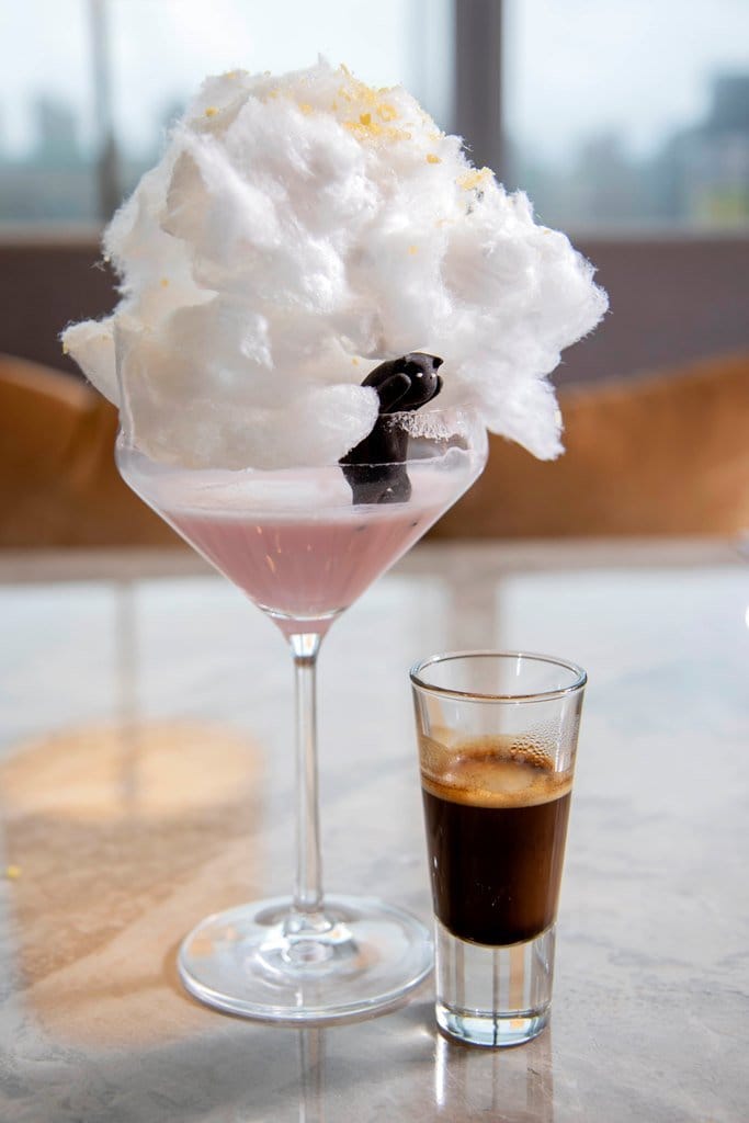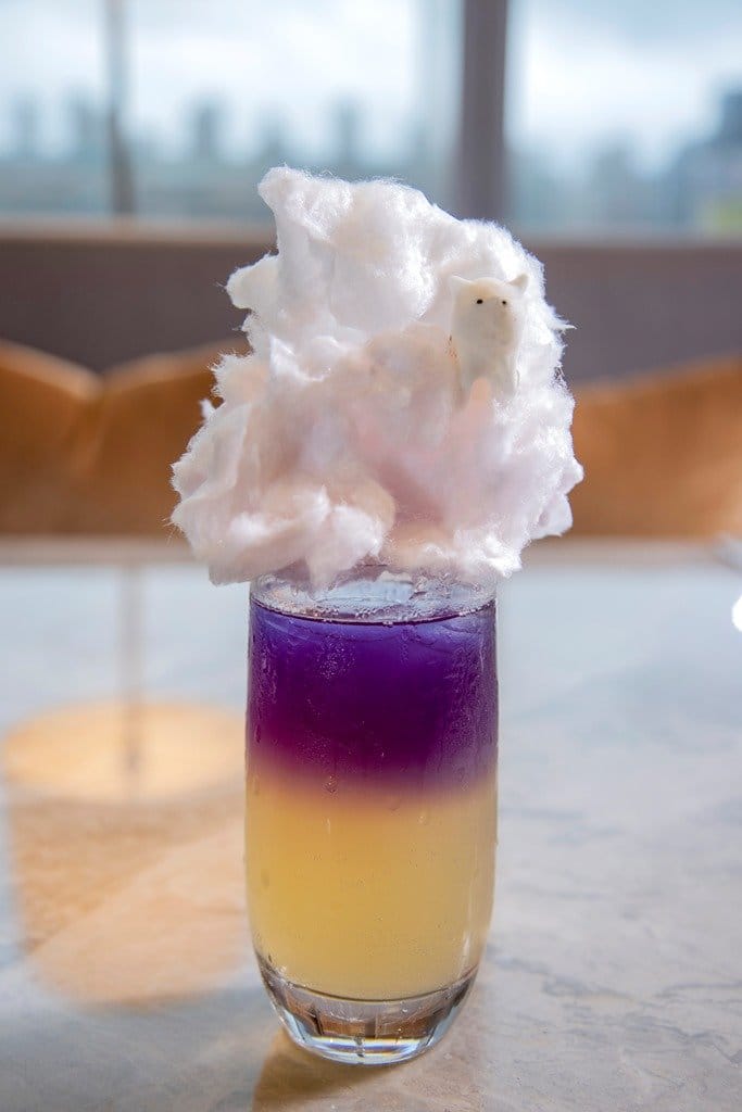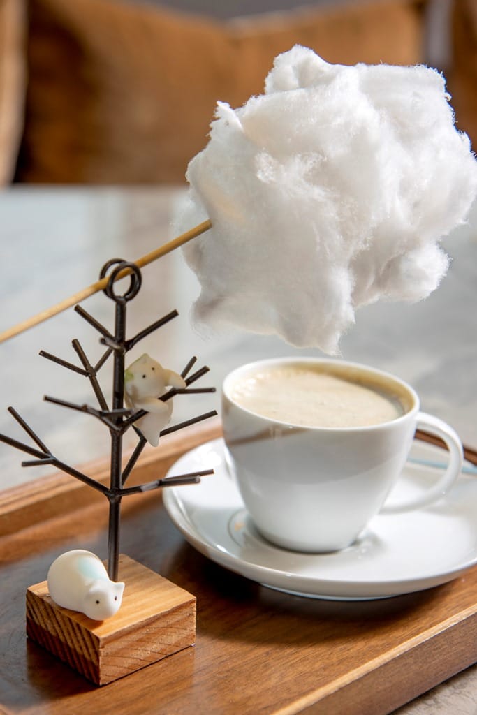 The Lounge則推出3款雲朵特調飲品,皆可做成冰或熱飲,搭配雙人下午茶可挑選2杯,若想單點也只要300元+10%。其中,「雲朵咖啡」最為夢幻,軟澎澎的白色棉花糖變成一團雲朵飄在黑咖啡上,隨著咖啡的熱氣緩緩往上蒸,棉花糖開始下起甜甜細雨,為咖啡增添甜味,也交織出雲與雨的浪漫畫面;「愛跳芭蕾的JC Cat」絕對滿足超萌少女心,粉紅色草莓歐蕾上頭撒著兒時記憶的跳跳糖,杯盤則趴著一只可愛的翻糖喵咪,喝之前先聞到瀰漫的草莓香氣,滑入舌尖後的嗶啵口感及甜蜜滋味,每一口都是驚奇;姊姊們最喜愛「熱帶香草菊蜜茶」,成熟韻味帶著些許俏皮,杯中一抹棉花糖雲朵,有隻翻糖貓咪慵懶地趴在上面,隨著熱茶注入杯中,棉花糖迅速消失,貓咪墜落到杯子裡,每喝一口茶,都會看到貓咪翻滾,好似在茶中潛水優游,淡淡的菊花茶香伴有一絲棉花糖的微甜,讓心跟胃都同時被治癒了。