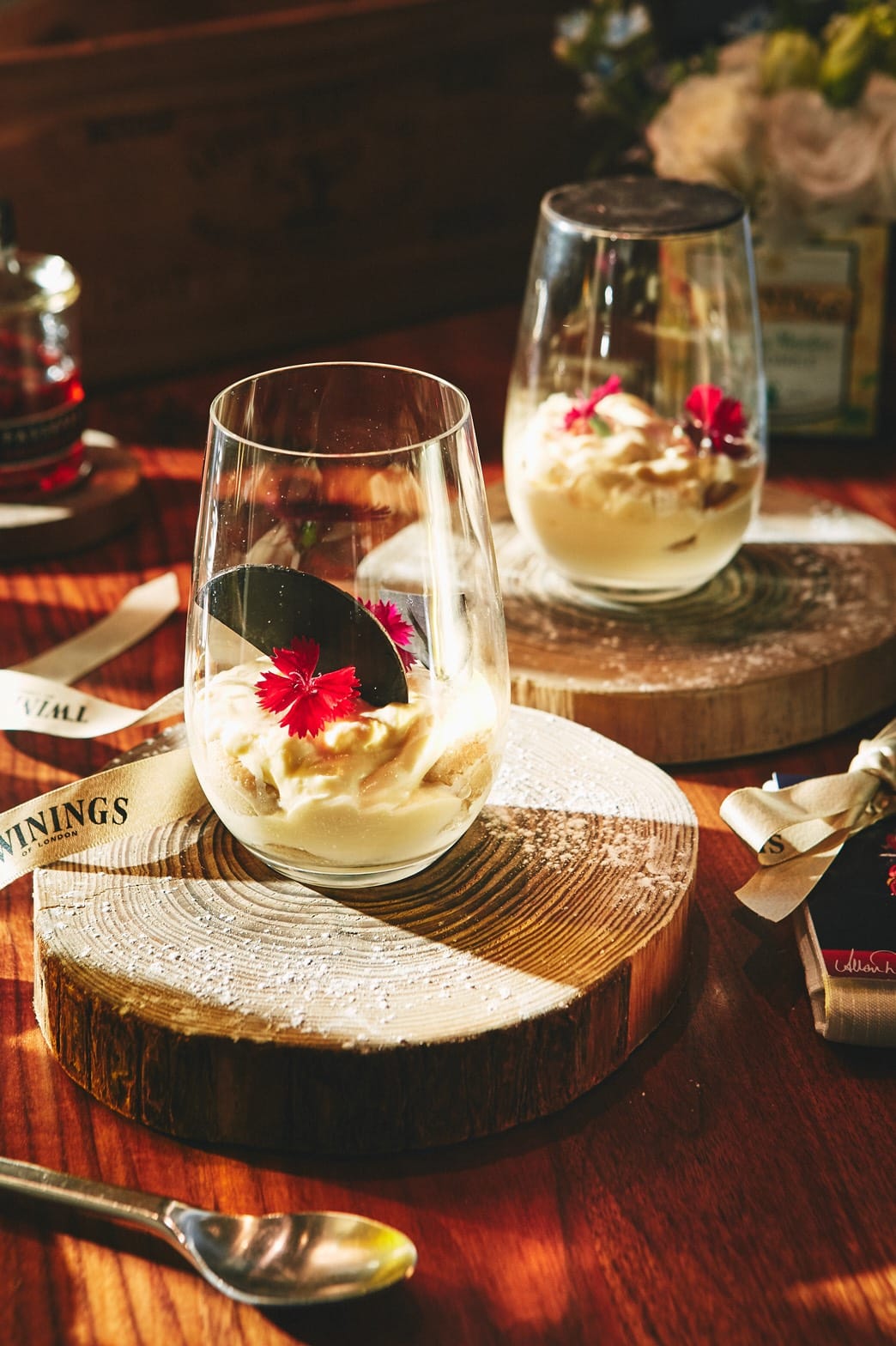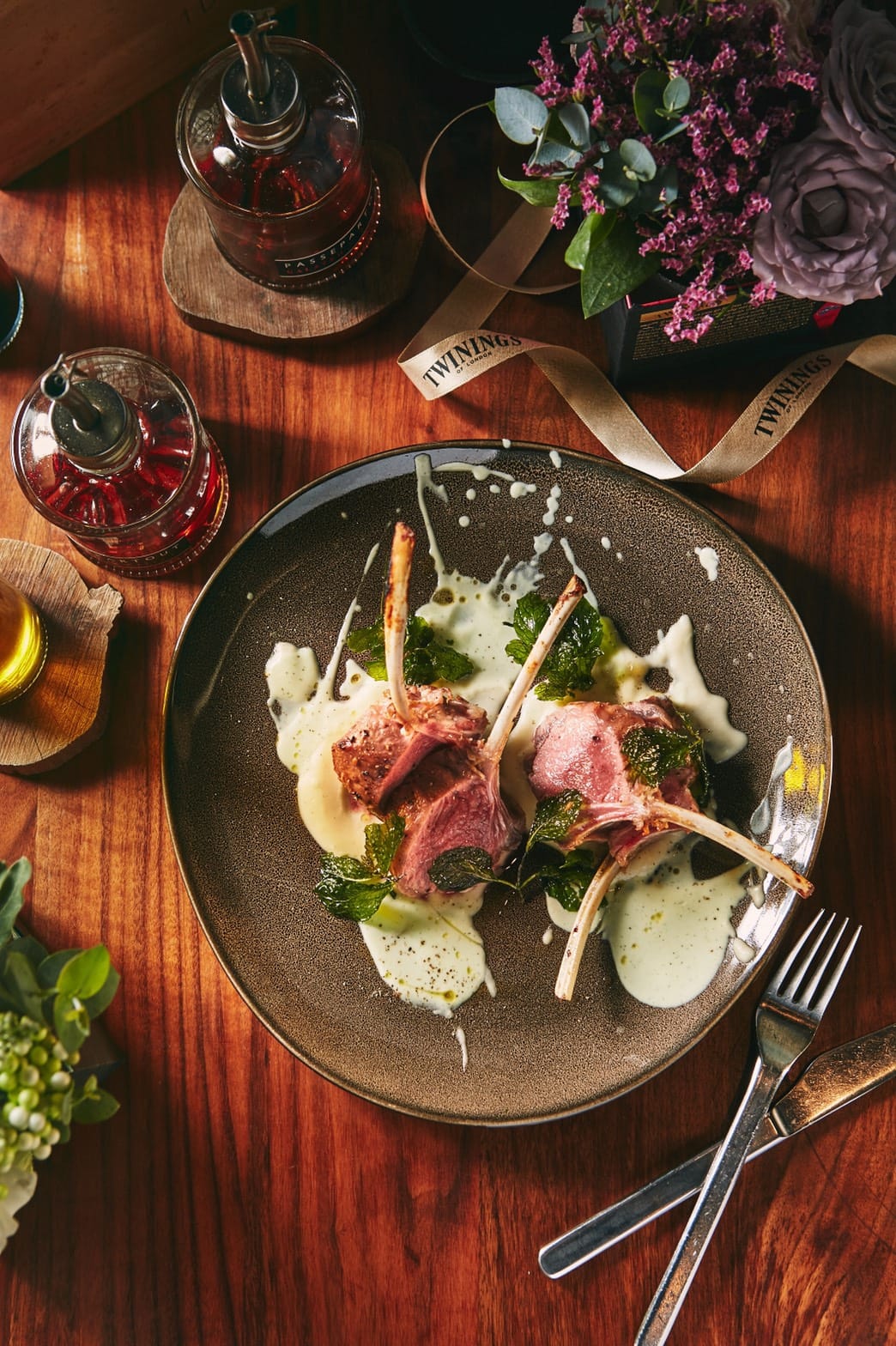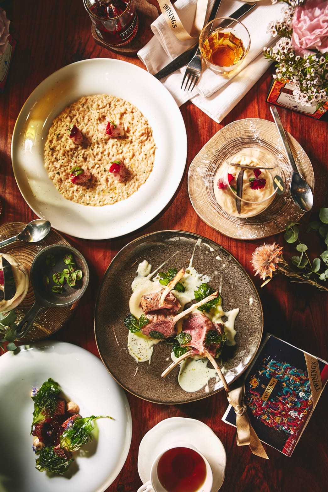 本次合作由Osteria by Angie來自義大利的行政主廚Erik Trozza,以Allan Deas的創作概念延伸,為唐寧茶研發設計專屬菜單,將唐寧鉑金系列茶品完美融合義式餐點,前菜嫩煎鴨胸佐鴨肝幕絲,搭配「胭脂莓果茶」製成的莓果凍,玫瑰果、非洲芙蓉、藍莓、覆盆莓和黑醋栗交織而成的酸甜果香,完美結合鴨胸鮮美細緻的油脂;以「琥珀焦糖博士茶」茶湯融合高湯燉煮而成的煙燻乳酪燉飯,淡淡焦糖香氣的獨特茶香,襯托野生紅蝦鮮味,及保留米心口感越嚼越香的飯粒;主菜紐西蘭美利奴羔羊排,搭配以「薄荷圓舞曲茶」特製薄荷醬佐馬鈴薯沫,更是必嘗美味,胡椒薄荷拼配綠薄荷多層次的清新襯托羊排鮮嫩多汁且毫無腥羶的美味;最後,洋甘菊風味提拉米蘇,以「晨光草原甘菊花茶」製成,充滿來自克羅埃西亞的洋甘菊清香,味道濃郁而不甜膩,點亮唐寧茶與安琪餐飲「義遊味境」的饗宴。