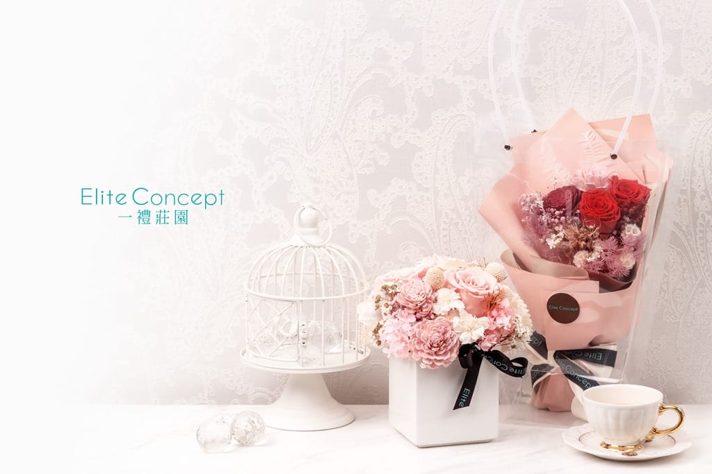 選用玫瑰永生花為主花,以典雅的淡粉色為主軸,搭配潔白色調的乾燥小花,打造豐富的視覺感,象徵永不凋謝的愛,一起獻給守護愛情的情人。