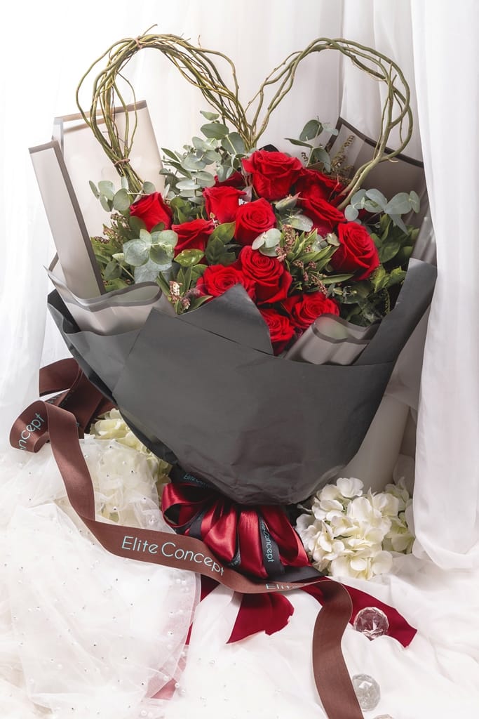 選用熱情經典的紅玫瑰,殷紅的玫瑰帶有淡淡的清香,也象徵對愛人真心、真誠的愛,14朵紅玫瑰組成的花束蘊含著愛你一生一世的濃情蜜意,並且有別於以往的鮮花束,搭配近期韓系流行的愛心藤蔓,讓兩人心中的愛意永續蔓延。