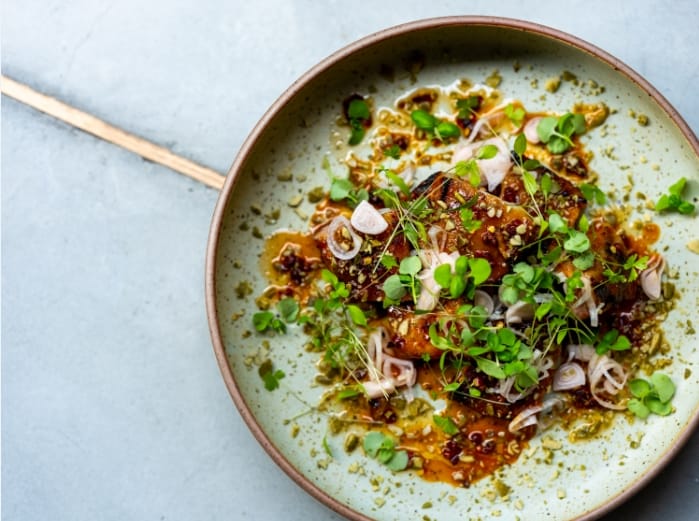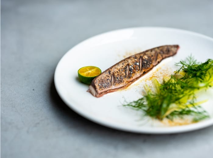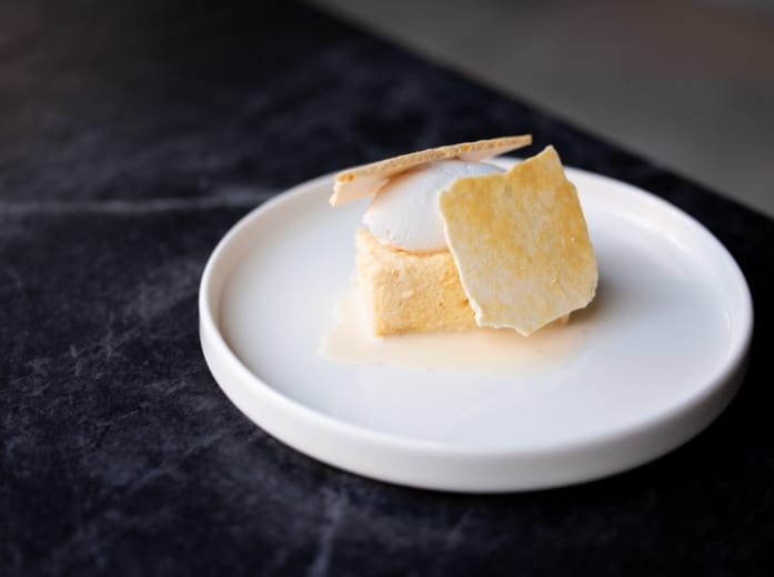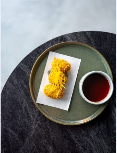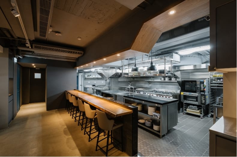 第二個吧檯面對開放式廚房,板前搖滾區可以近距離欣賞主廚精湛的廚藝。餐點由Gēn Creative 操刀設計,美籍韓裔主廚趙韓淞坐鎮,延續新美式料理的精神,運用在地食材將加州風格的創意餐點以單點、小份量、分享方式呈現。有別於Gēn Creative 以「地、海、陸」等主要食材設計菜單,Bottless 將餐點區分為「200、360、520、760、260 甜點」五個價格帶,菜餚設計著重呈現單一食材美味,價格更親民,用餐風格也更輕鬆,可以自由在不同的價格帶裡挑選合適的餐點。