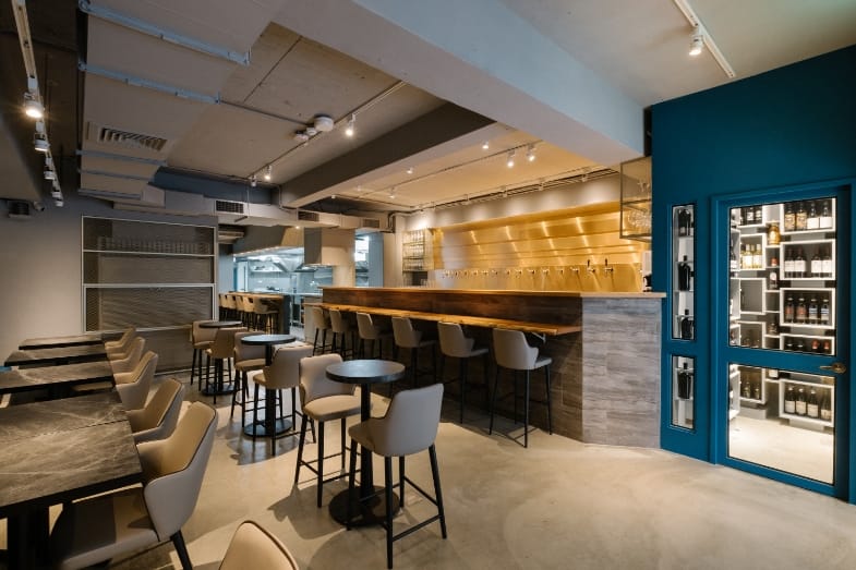 餐廳設計了兩個吧檯,推開大門,映入眼簾的是閃著金光的酒水吧檯!一字排開14 支龍頭供應Affinato&Lunetta 從世界各地網羅的佳釀。採用歐美流行的環保可回收PET 桶裝葡萄酒技術,恆溫、無氧、無汙染,供應高品質且穩定性佳的葡萄酒。此外,大幅降低碳足跡、減少空瓶回收量和包裝費用,回饋給消費者的是每一分錢都花在酒的品質上,讓每一杯都跟剛開瓶一樣新鮮。跳脫以往瓶