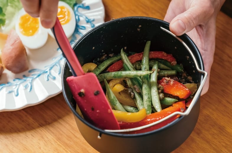 1.先將四季豆、甜椒、酸豆、黑橄欖、鯷魚、大蒜、橄欖油拌勻,放入專用烘培圓鍋。