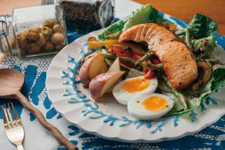 食材:鮭魚(鯖魚也可)、四季豆、甜椒、酸豆、黑橄欖、鯷魚、大蒜、橄欖油、海鹽、雞蛋、馬鈴薯、生菜。