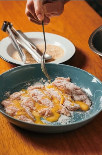 1. 先將雞柳條以鹽、黑胡椒調味、帕馬森起司增加風味,再撒上少許麵粉,沾上蛋液、麵包粉,可先用乾鍋煎( 增添色澤及香味)。