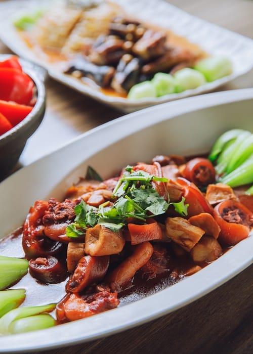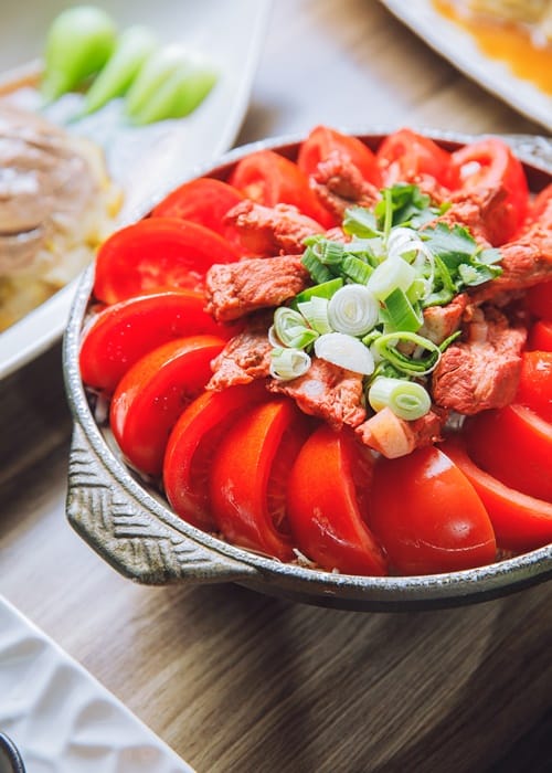 「栗子燒豬尾」是另一道老台菜創新的經典範例,這道菜源自從前達官貴人吃慣了豬肉,所以改選較稀少的豬尾為主食材。處理時先使用低溫熟成,將溫體豬洗淨後油封,鎖住其中的風味,再加入紅麴與老滷醬汁以小火細燉慢滷,搭配油炸過的栗子和滷過的杏鮑菇,Q彈軟嫩的豬尾蘊藏濃郁風味,散發著微微的醬香氣息,一口吃下,感受濃濃台味。「番茄排骨鍋」是酒家菜的經典料理,湯品可以協助醒酒,在當時是每桌必點的料理,在「十得私廚」同樣能夠吃到這份古早味。酸甜濃郁的番茄排骨湯,料理過程同樣費工,特選軟骨排方便客人食用,將排骨先油炸後再滷製兩個多小時,再加入炒過的番茄及自家提煉的老母雞高湯一起熬煮。林弘致副總分享,許多日本客人非常喜歡這道湯品,喜歡搭配清酒一起喝,甚至將整鍋湯喝到見底,讓他非常開心。