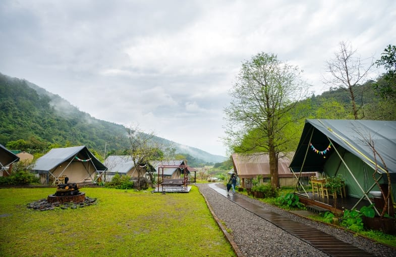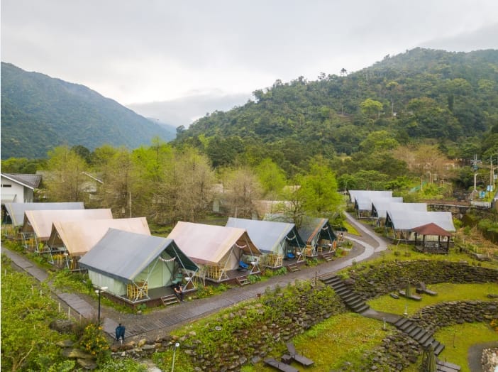 18座奢華帳篷錯落其中,採狩獵帳篷設計,頂級帳篷帆布縫製,材質防火、抗紫外線,帳內高挑寬敞、通風良好,每頂帳篷內都設有吊燈、舒適床墊與寢具,分為一大床、二大床、四小床等房型可選擇,還有休閒椅以及電風扇、移動冷氣機(可設定暖氣)等,最棒得是有馬桶、淋浴盥洗的獨立衛浴設備,水量大、水溫夠熱,只要攜帶行李即可輕鬆入住,躺在床上或是坐在帳棚外的鞦韆椅、搖籃吊椅就能體驗親近大自然的美妙。園區生態景觀極為豐富,常可見各類蝴蝶、鳥兒身影,偶遇台灣獼猴、台灣藍鵲、白鷺鷥等野生動物,聆聽大礁溪水潺潺與悅耳鳥鳴,到了晚上,點亮帳篷外燈光,夜色中的露營區分外迷人,四月中旬後螢火蟲也出來了,一閃一閃的飛舞,這景象美得讓人捨不得閉眼,假日還會升起熊熊營火,再伴隨著貓頭鷹、山羌、啄木鳥與青蛙叫聲甜蜜入夢。