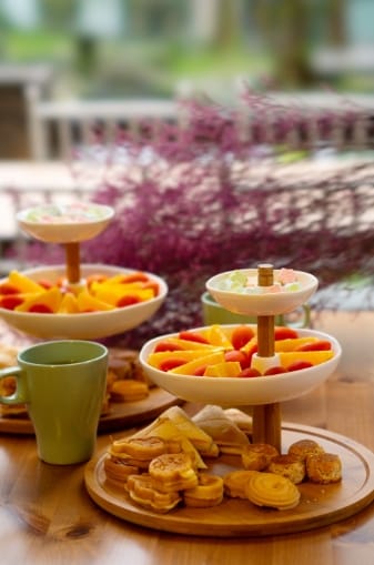 除了媲美飯店等級的規格與設備,「那一村Nayi Villa」提供的餐飲也很講究,嚴選台灣小農的作物,宜蘭當季新鮮食材和特色小吃,一般入住即可享用免費自助中西式豐盛早餐,包括現煎荷包蛋、蘿蔔糕,在地有名的鴨賞、魚丸湯等。還有全包餐優惠專案,包含早餐、晚餐,贈送精緻下午茶乙套,晚餐依每帳可選擇一套藥膳鴛鴦火鍋或烤肉套餐,藥膳火鍋為主廚獨特研發,湯底選用十幾種漢方藥材和香料熬煮而成,原味、麻辣雙口味。不論是漢方秘製鍋或是烤肉饗宴,搭配的海陸配料、多樣蔬菜盤好澎湃;另又可享用自助無限沙拉吧,沙拉、水果、開胃菜、炸物、甜點等以及現煮的擔仔麵,現煎宜蘭三星蔥油餅,香氣四逸、香脆口感,吃到飽的熱情款待,大大滿足味蕾與戶外用餐樂趣。