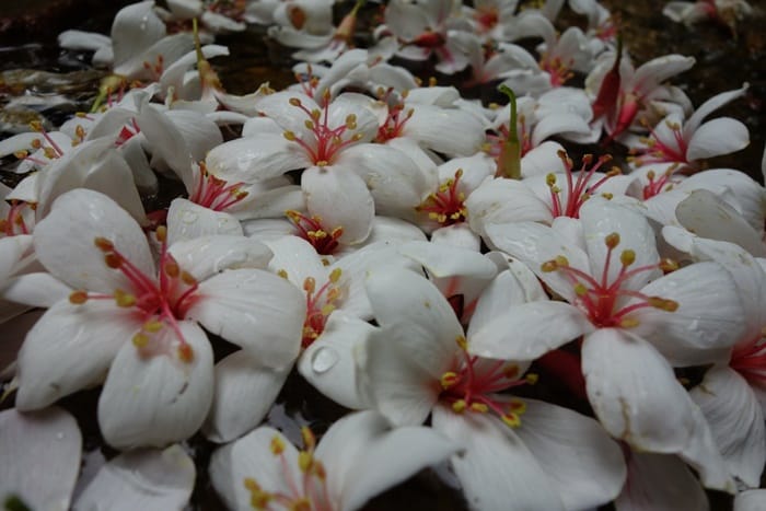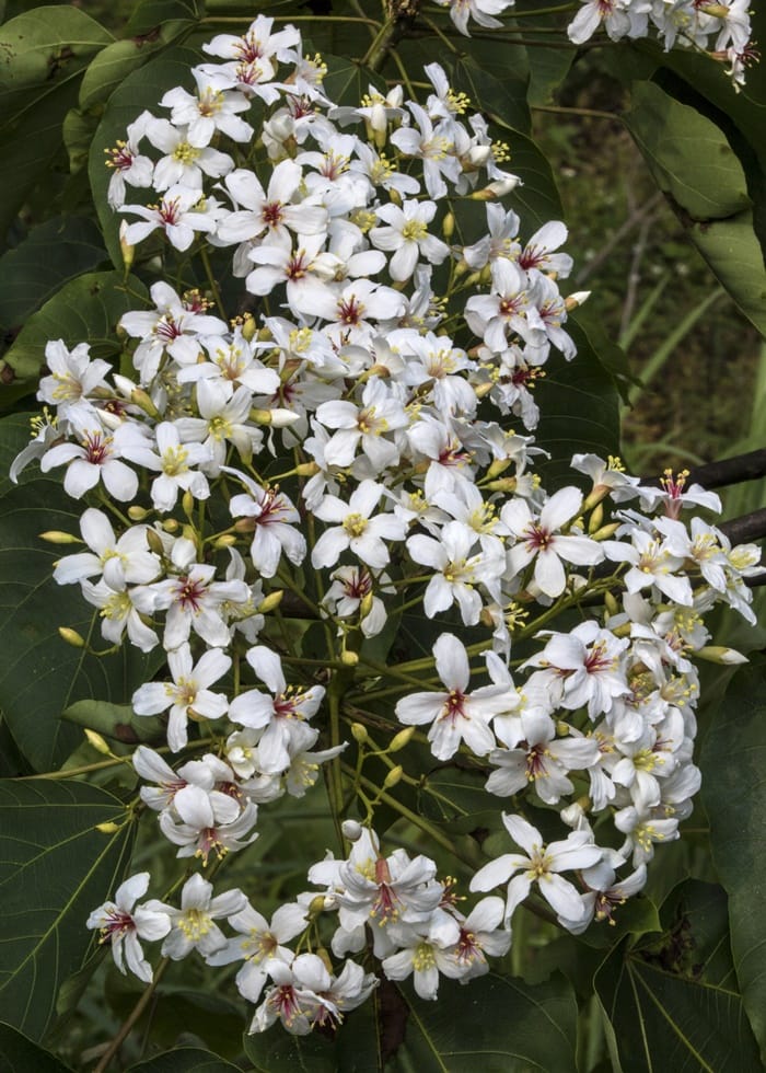 十二寮古道位於十二寮休閒農業園區內,屬於老少咸宜,適合親子同遊 的賞桐景點,沒有陡坡也沒有遙遠的路途,輕鬆愜意置身於山林美景中。 十二寮昔日為樟腦油的盛產地,以十二寮埤為中心,三面環山,谷地中埤 塘錯落,湖畔風光旖旎,古道共有7個登山口,可依體力選擇路線。桐花 最多的地方在第四登山口與第六登山口入口處,循著石階而上,桐花夾道歡迎,腳下踩著雪白的天然花毯,彷彿置身山林中的精靈。走完古道還覺 得意猶未盡的話,那麼不妨留點時間給十二寮大埤環湖步道,一片綠草如 茵點綴著雪白桐花,綠色湖面倒映出山林美景,周圍也有不少咖啡館可選 擇,是一條令人全然放鬆的賞桐景點。