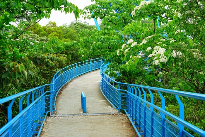 有全國最高自行車道之稱,位於苗栗縣銅鑼鄉九湖村,而天空步道其實 是「銅鑼自行車道」其中的一段,行人與自行車共行,車道沿著九華山稜 線而建,其中景觀橋和古意吊橋,橫跨於虎頭崁古道與挑鹽古道之間的山 谷,置身其中有如行走於天空而被稱為「天空步道」及「天空吊橋」。由 於自行車道中有大約5公里是與茶園產業道路連結,除了油桐花外,寬闊的茶園景觀也是銅鑼自行車道特色之一。天氣晴朗時湛藍的天空和水藍橋身 相互映襯,煞是好看,橋身穿梭在油桐樹林間,信步橋上如同飛翔於林梢 的小鳥,每一朵油桐花都近在咫尺,居高臨下又能欣賞茶園風光與平原景 緻,登上景觀台,更可眺望遠方滿坑滿谷的桐花將山頭覆蓋成了一層桐花 雪的美景,幸運的話連通霄、苑裡的海線風情同樣一覽無遺。