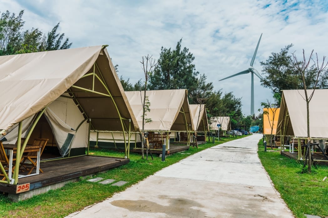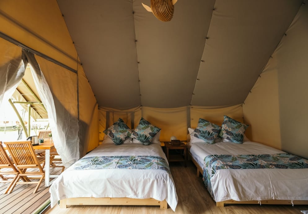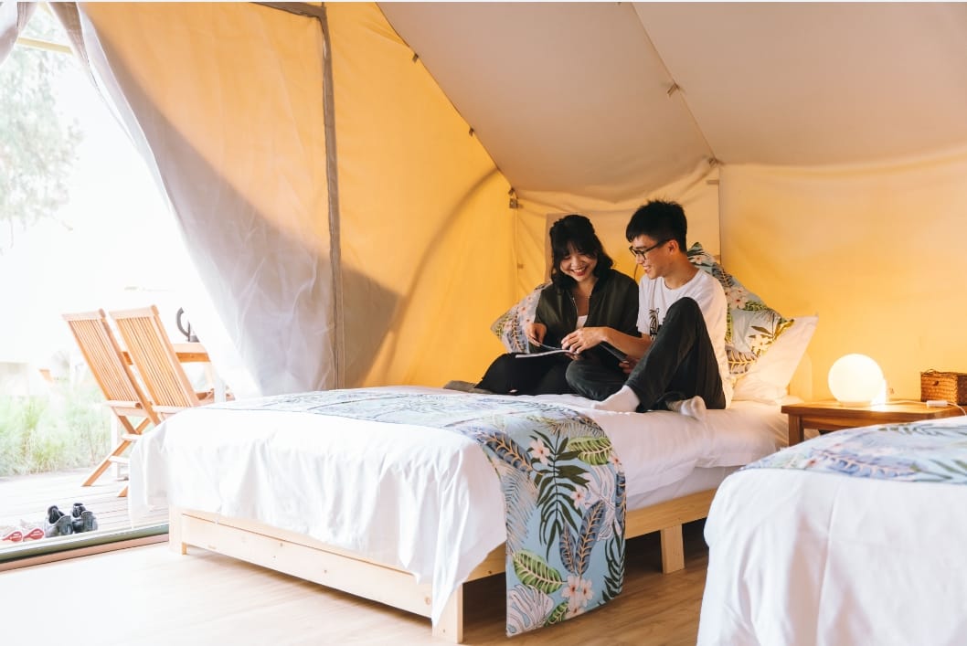 融入海濱園區特色,露營豪華帳篷嶄新搭建,帳篷分有二人、三人、四人床型滿足各旅群需求,除了汕海、禾風、風野三款不同風格造型的帳蓬,還有海景第一排視野極佳的海上屋納海木屋帳,略帶異國情調。使用法國進口頂級帳篷帆布縫製,材質防火降噪抗紫外線,帳內寬敞舒適,帳篷內都設有沙發、床墊與寢具,電風扇及冷氣機,戶外鞦韆椅等,另備有私人浴衛,附有馬桶、淋浴盥洗的獨立衛浴設備,所以只要攜帶輕便的行李即可輕鬆入住。