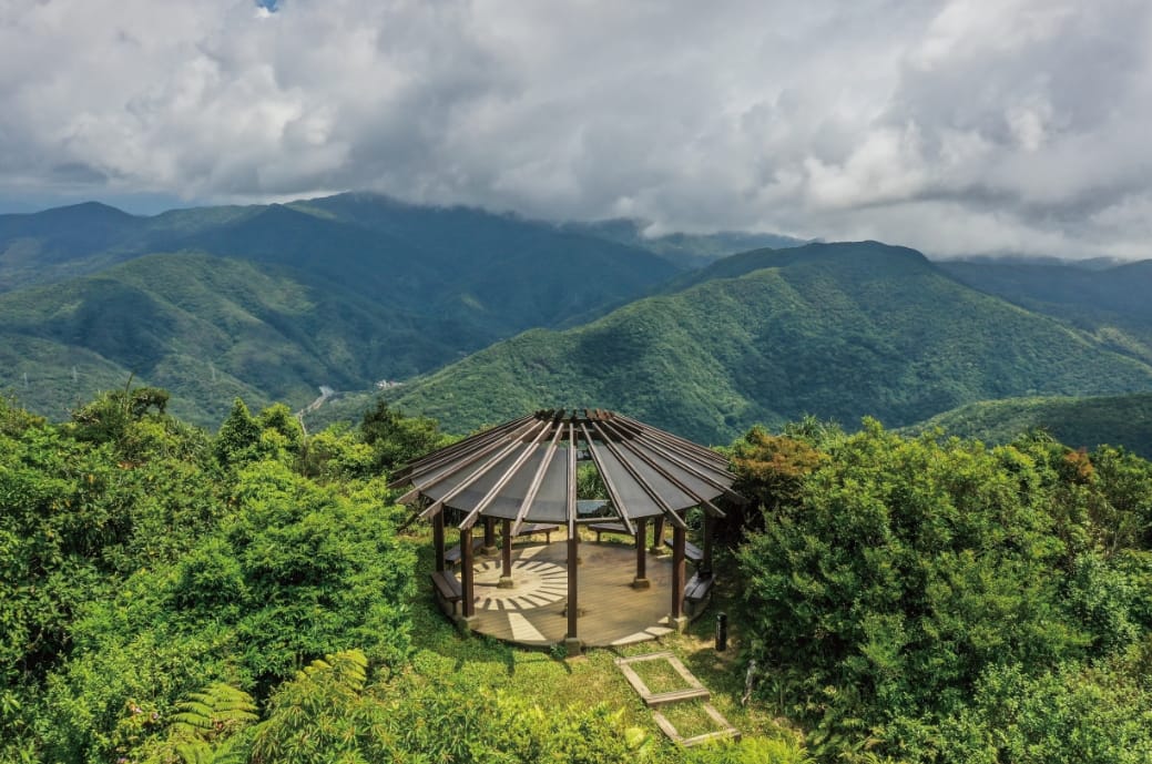 山頂設有一涼亭,近年才剛修葺完成,此涼亭屋頂刻意設計成中空,是源於山頂的風太大,此結構可以降低風阻,減低屋頂受損率,但反而抬頭望去,圈出一個圓形的藍色天空,煞是可愛。向外眺望,若天氣佳、能見度高,則能望見隱於青山後的碧海―太平洋與台灣海峽。在雙流國家森林遊樂區,親山、親水,或散步、或健行、或攻頂,多元的選擇讓全家大小都能好好森呼吸,盡情享受山林之美。
