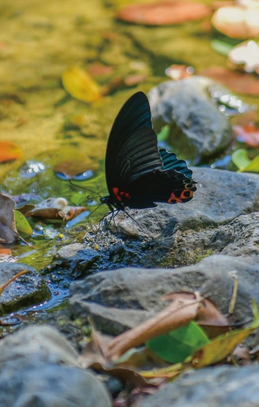 破壞的環境,成為蝴蝶生長、過境的最佳場域,故此地亦有「蝴蝶天堂」之稱,《雙流蝶影–雙流森林遊樂區賞蝶手冊》就記載了200種蝴蝶,以鳳蝶、斑蝶、與粉蝶科最多,常見於水流平靜的涉水區;蜻蜓點水、蝴蝶展翅、豆娘飛舞,能被如精靈般的小小昆蟲圍繞,幸福感油然而生。溪裡則常見馬口魚、石魚賓魚、鉛色水鶇、拉氏清溪蟹、太田樹蛙……等等。每年的12月至梅雨來臨前的枯水期,涉水區因位處下游,水量減少,溪流變成一灘灘的水窪,可見南部特有的過山蝦和鱸鰻,爬越過陸地,至另一個水窪求生的奇妙景象。