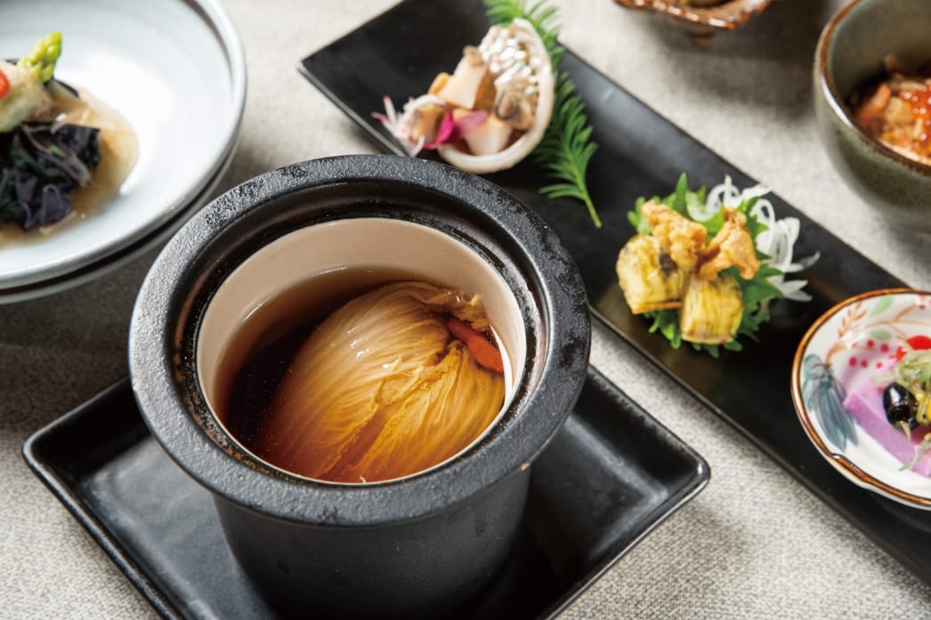選用南投有機玫瑰與紅酒製成的玫瑰醋,在餐點之間刷新味蕾與幫助消化。玫瑰醋之後是湯品、蔬食、甜品與水果。張學良喝湯講究,尤其要求湯必須夠熱,少帥禪園使用的湯碗特別選自日本,兩層設計格外保溫,確保客人食用時湯品夠熱。主要以老母雞、娃娃菜、枸杞、牛蒡燉熬的養生湯品,無糖無鹽,原味養生。大魚大肉後,蔬菜是必須攝取的飲食,這季推出紅鳳菜,紅鳳菜又名補血菜,含水量高並富含花青素,並以超過十種以上食材烹飪而成,味道層次相當豐富。