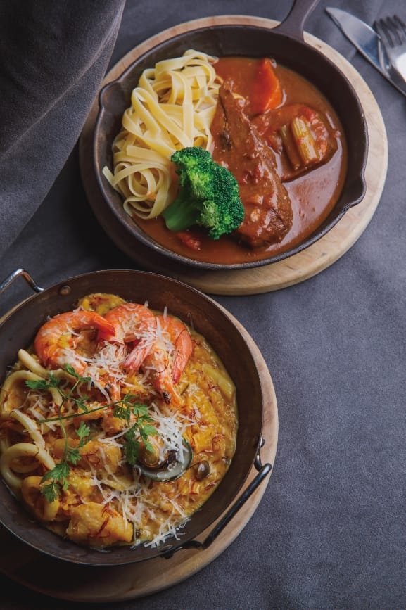 Paella是西班牙最知名的料理之一,甚至有「西班牙國寶飯」之稱,鍋內以米飯和海鮮組成,碩大鮮蝦的紅色與燉飯的金黃色,呈現出活力十足的西班牙風情。燉飯偏向西班牙的原味口味,米粒較為Q彈,每一口都吃得到滿滿的香醇醬汁,燉飯必須以海鮮湯頭緩慢煮熟才能如此入味。