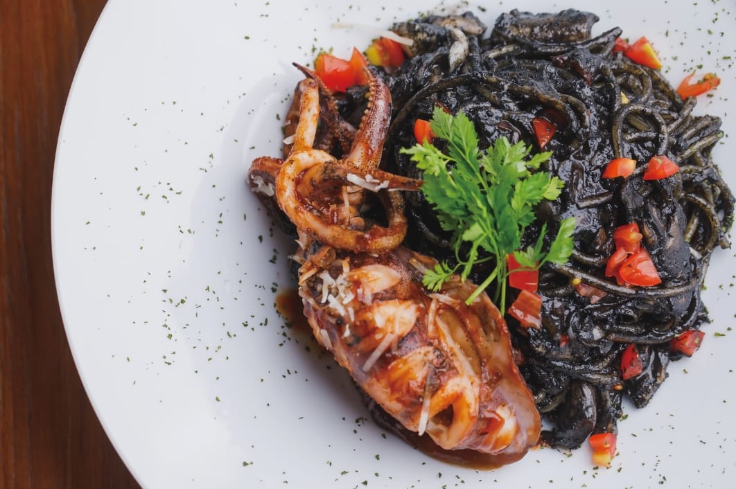 有多久沒吃到真正的墨魚麵呢?坊間餐廳的墨魚麵大多使用現成墨汁處理,口感上遂少了一份新鮮的墨魚滋味。WINE-derful的蒜香墨魚麵,以新鮮透抽墨囊的墨汁製成,加上蕃茄、蒜頭、鮮奶油等秘制配料,經過八小時以上的熬煮,最後打碎而過濾出閃耀新鮮的墨魚醬汁。蒜頭在這道料理中亦扮演了味覺平衡的重要角色,蒜味過重容易讓人避而遠之,蒜味不及則襯托不出墨魚汁的鮮美,恰到好處的提味,往往是一道料理的重要關鍵。