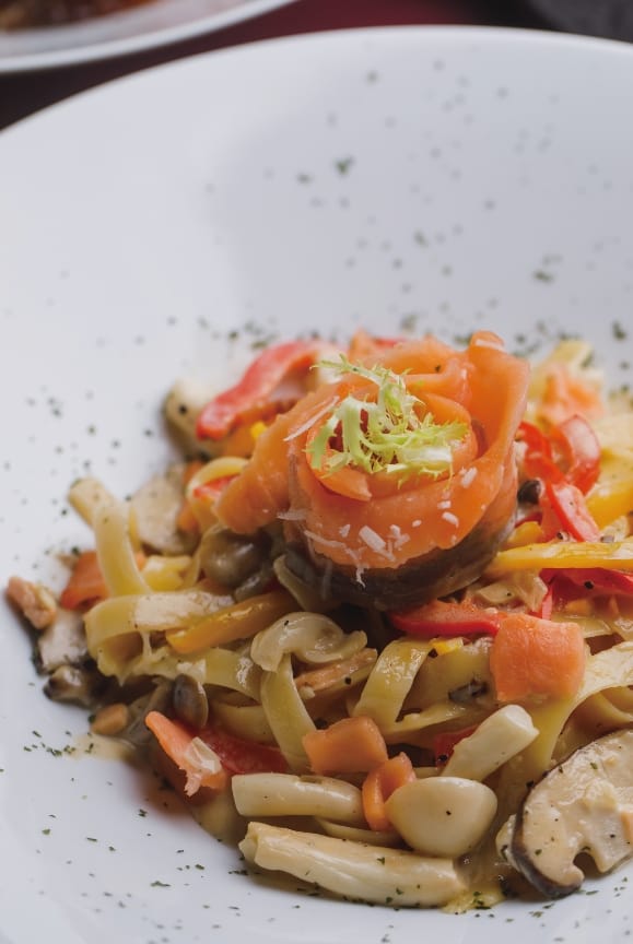 最新推出的藍乳酪鮭魚義大利麵,甫端上桌就飄散出熱騰騰的乳酪香氣,令人饞涎欲滴。一提及藍乳酪,許多人估計無法接受黑點斑斑的視覺,以及濃稠的乳酪味,單吃是一項挑戰,但如果做成醬汁便可以成為多數人能接受的美味,這道主餐比傳統奶油白醬更增添多重層次,鮭魚薄片的玫瑰花亦提升了視覺的精緻感。
