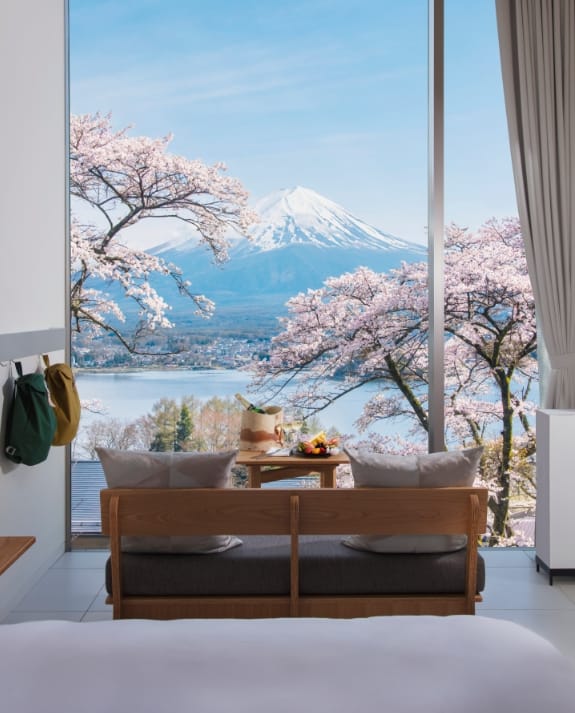 「虹夕諾雅 富士」營造出奢華野營的生活品味風格,所以不必辛苦自己搭帳篷,40間客房(Cabin)以方格狀的「居住艙」設計,層層相疊隱身於山野綠林中,室內以白色為基調、清新明亮;最奢侈的莫過於每間房都面朝富士山,大面落地窗景就好像框住了大山的絕美景致,成為一幕幕四季流轉的自然畫作,而開放式的陽台,夏天擺放沙發與抱枕,冬天為日式暖桌,在此閒坐一整天,永遠都看不膩河口湖與富士山相映照的讚嘆畫面。更貼心的備有B&O藍芽隨身音箱可隨時聽音樂,還有提供超輕暖大衣,便於戶外活動的保暖呵護。