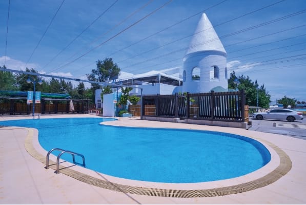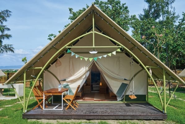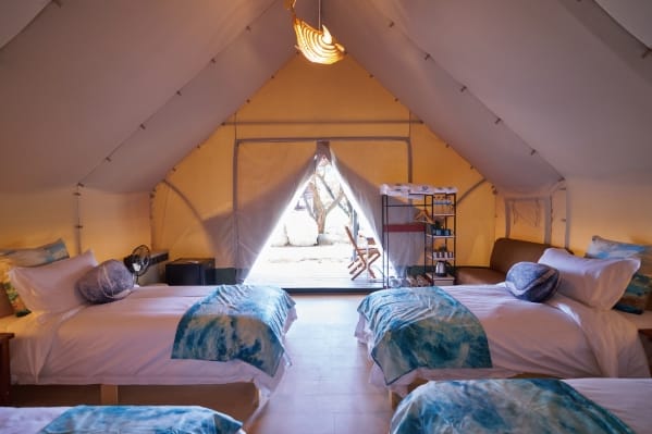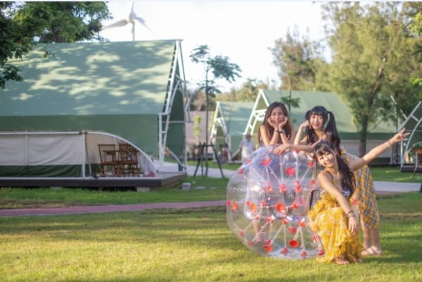 想要來點動態活動,戶外戲水池和游泳池可盡情玩水,戶外草地有泡泡足球、羽毛球、射箭休閒活動等,假日還會升起熊熊營火,以及晚餐時段live band現場演奏,還有瑜伽課程,讓露營假期更添精彩。走出露營區一眼所及就是大海,享受風浪快感,衝浪及風箏衝浪最熱門,當夏日海風吹來,漫步夕陽西下與星空夜晚,浪漫指數更是破表。此外,園區設有觀海餐廳及輕食咖啡吧,全包式豪華露營一泊三食,附有早晚餐及下午茶,嚴選在地旬味的農特產品和料理小吃,以及深受饕客讚賞的漢方秘製藥膳鴛鴦火鍋,海陸配料豐盛的烤肉套餐任選,海邊用餐更顯閒情逸致。