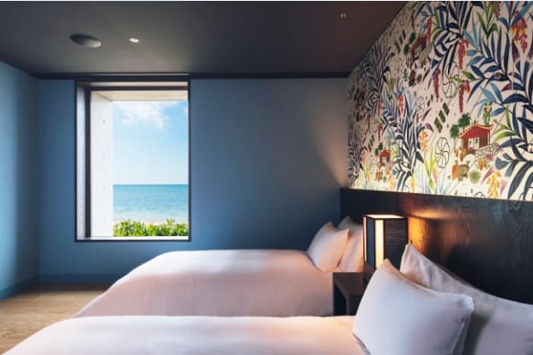 以「打造新的海岸線」為設計概念,為了減少對海岸原始生態的影響,客房別墅採低矮樓層設計,同時沿海岸線蜿蜒而建,使建築物與四周的自然環境融為一體。館內設有100間舒適的海景客房,旅客能近距離觀賞美麗海景,也能感受透過寬敞的窗戶感受海風帶來的海洋氣息。房內各處也擺放著沖繩的傳統工藝品,與頗具現代感的建築巧妙結合。