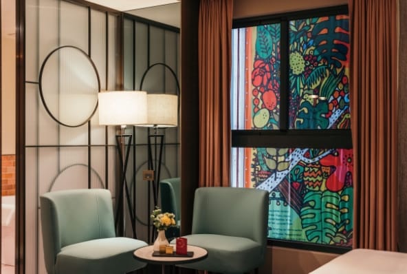 一樓大廳名為迎財廳,以石材、溫潤木色構築,電視螢幕播放齊柏林導演拍攝的「飛閱高雄」影片,讓旅客可以先行認識美麗南台灣。「JÒHŌ」共有60間客房,將「JÒHŌ祝福」經由設計注入於每個視覺空間,討喜的紅色房卡套內附一塊錢,希望房客圓滿福滿。樓層分別以福客居、祿客居、壽客居命名,緋紅、咖啡金、綠色為代表色,運用在整體客房的風格陳設和家具,象徵圖案分別為蝙蝠、鹿、鶴,希冀祝福每位入住旅客迎來桃花好人緣、進官加祿發財、一切平安康泰。又值得一提,為解決客房兩側看到緊鄰的牆壁,執行長發揮創意,特別請到日本插畫家繪製具台灣意象的插畫懸掛於窗外,且每層樓圖案都不同,首創之舉讓房客可以開心拉開窗簾,欣賞繽紛色彩亮點的藝術窗景。