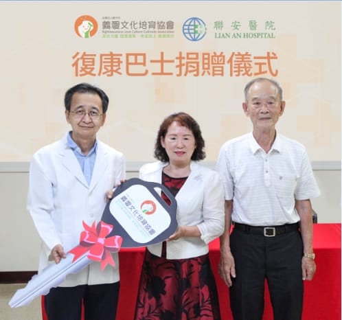 社團法人臺中市義愛文化培育協會7月3日上午於臺中市聯安醫院舉行「復康巴士捐贈儀式」,由善心人士林俊夫先生透過義愛文化培育協會捐贈一輛100多萬元復康巴士,預計每天服務約35人次,讓聯安醫院能持續擔負起完善地區醫療網的重任。協會代表-廖婯堳理事、聯安醫院柯貴榮院長及林俊夫先生皆親臨會場參加捐贈儀式。