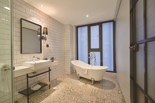 純白風格浴室,黑框窗與毛玻璃組合獨具特色,牆面以白色磁磚拼貼,地板同樣為馬約利卡磁磚,部分房型的貓爪浴缸和孔明鎖包裝的備品,彩色雕花玻璃漱口杯都是亮點,帶來現代主義靈魂貫穿的宿泊新體驗。