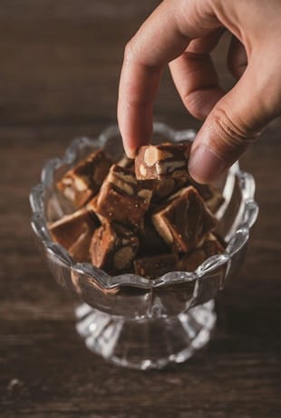 「上信饌玉」的「太妃糖」顛覆傳統印象,融合依思尼Isigny奶油、手工熬煮的深琥珀色焦糖,奶香中和了焦苦味,再加入滿滿的加州杏仁果,奢華風味及豐富的香氣,香脆不黏牙,2019年榮獲有食品界米其林之稱的比利時iTQi風味絕佳獎章二星殊榮。