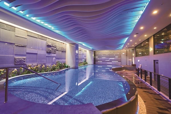飯店B1的「品休閒」休閒中心,整體明亮、乾淨寬敞,讓人一眼就很喜歡待在這裡,很有度假Fu。設有常溫游泳池、SPA按摩池、有氧健身房、烤箱蒸氣室一應俱全。風格為亞熱帶叢林風,以波浪式天花板、大片石材牆面及植栽為設計主軸,搭配燈光色系的變化和音樂營造愉悅氛圍,全然給予身心有更多能量,徹底放鬆紓壓。