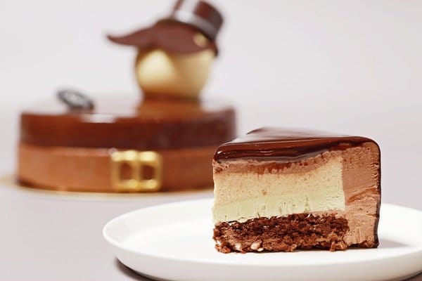 點心房主廚重新演繹晶華酒店經典蛋糕品項–魔鬼的呢喃,並結合台灣盛產水果—香蕉為主角打造專屬於爸爸們的甜蜜滋味,主廚先將糖加熱炒成焦糖狀,倒入溫熱的鮮奶油,與新鮮香蕉製成的香蕉泥均勻攪拌,再依序加入吉利丁、打發鮮奶油拌勻後,放入急速冷凍機製成的香蕉內餡,夾入以Cocoa Barry 72% 黑巧克力製成的巧克力慕斯,外層淋上黑巧克力醬淋面,最後綴上以巧克力手工塑型製成的老爸立體造型巧克力,戴上高帽和鬍子的模樣,俏皮又可愛讓人會心一笑。