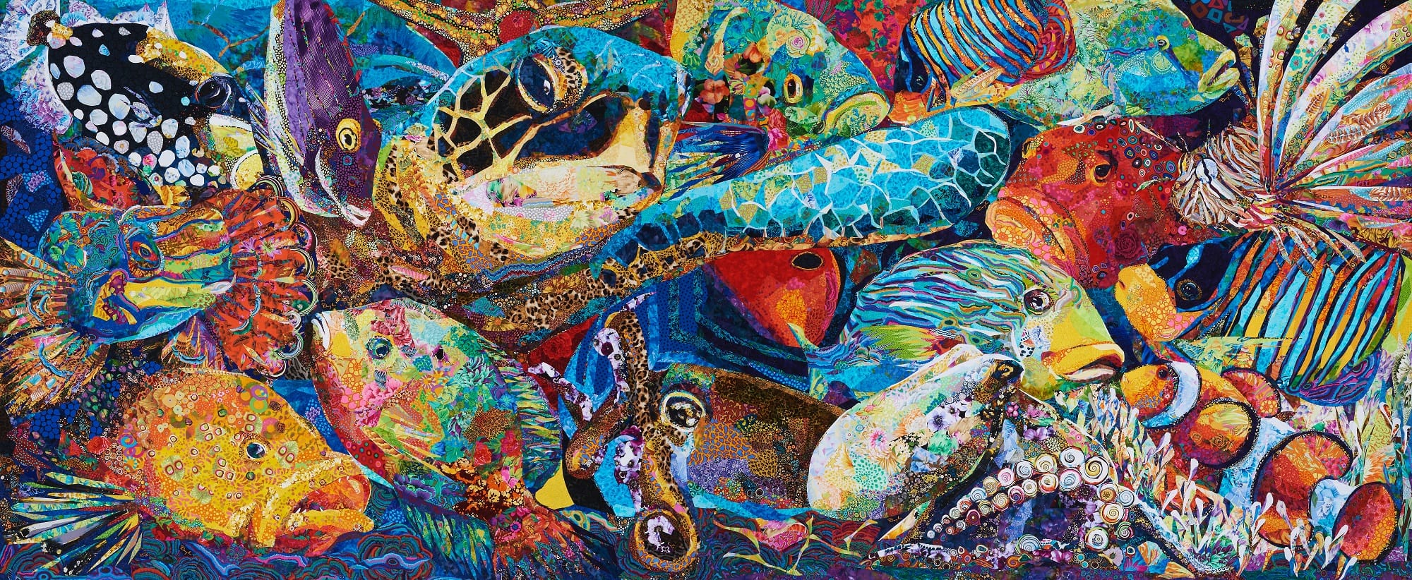 為了創作這幅〈ABYSS〉,劉棟特地飛到日本沖繩的美麗水族館去觀察海中生物的種類、樣貌、律動、色彩……也跑了好多趟屏東國立海洋生物博物館,在創作時,順著花布的引導,一再調整底稿,「生物的種類、魚頭的方向都改變了好多次。」果真,一展出就又大獲好評。
